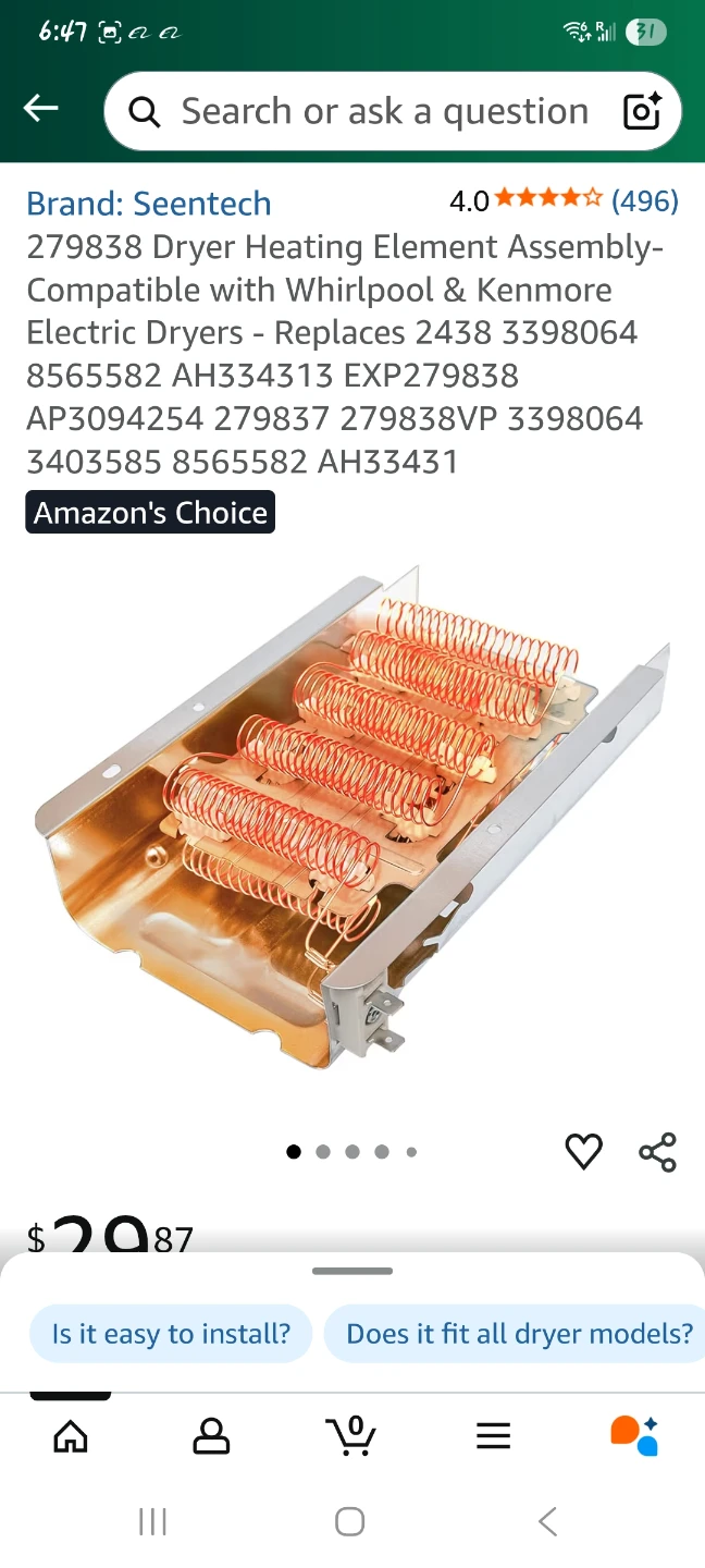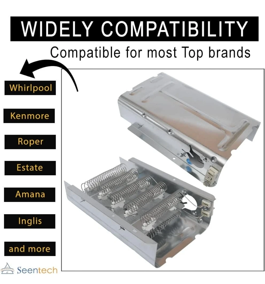 I'm selling a Seentech 279838 dryer heating element assembly. It's compatible with Whirlpool and Kenmore electric dryers. This part provides heat to the dryer and replaces part numbers 2438, 279837, 279838A, 279838VP, 3398063, 3398064, 3403585, 8565582, AP3094254, W10724237, and WP279837.