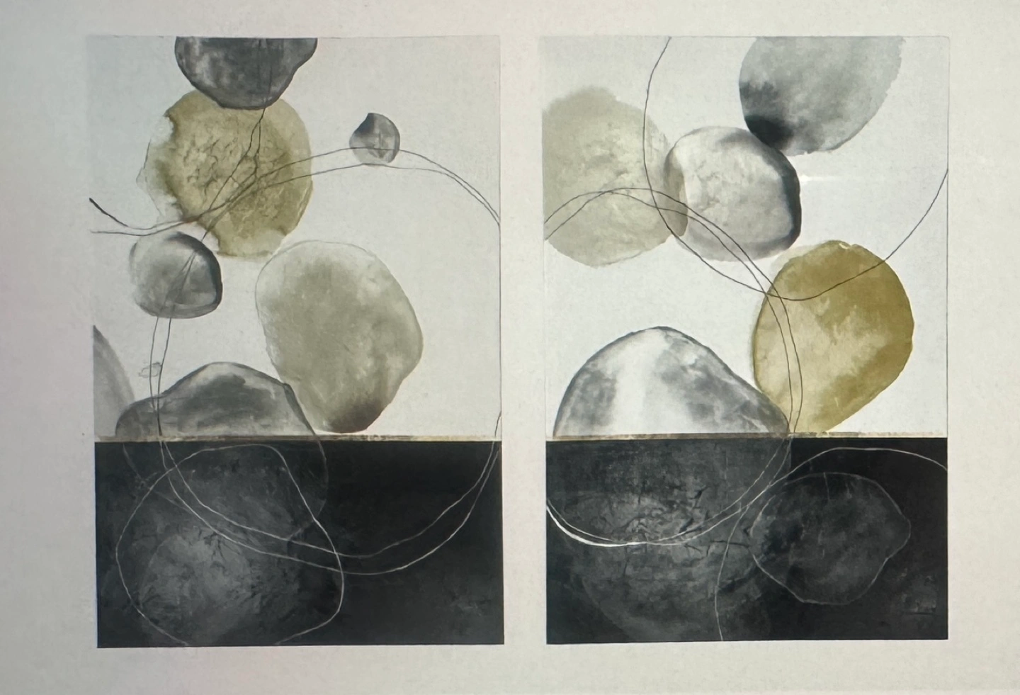 Modern minimalist artwork. Two panels feature grey, beige and black watercolor shapes. Fine lines throughout. Neutral colours. Contemporary style.