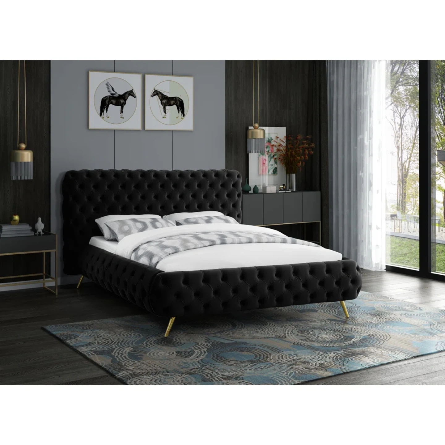 Black Velvet Tufted Bed Frame with mattress and its protector