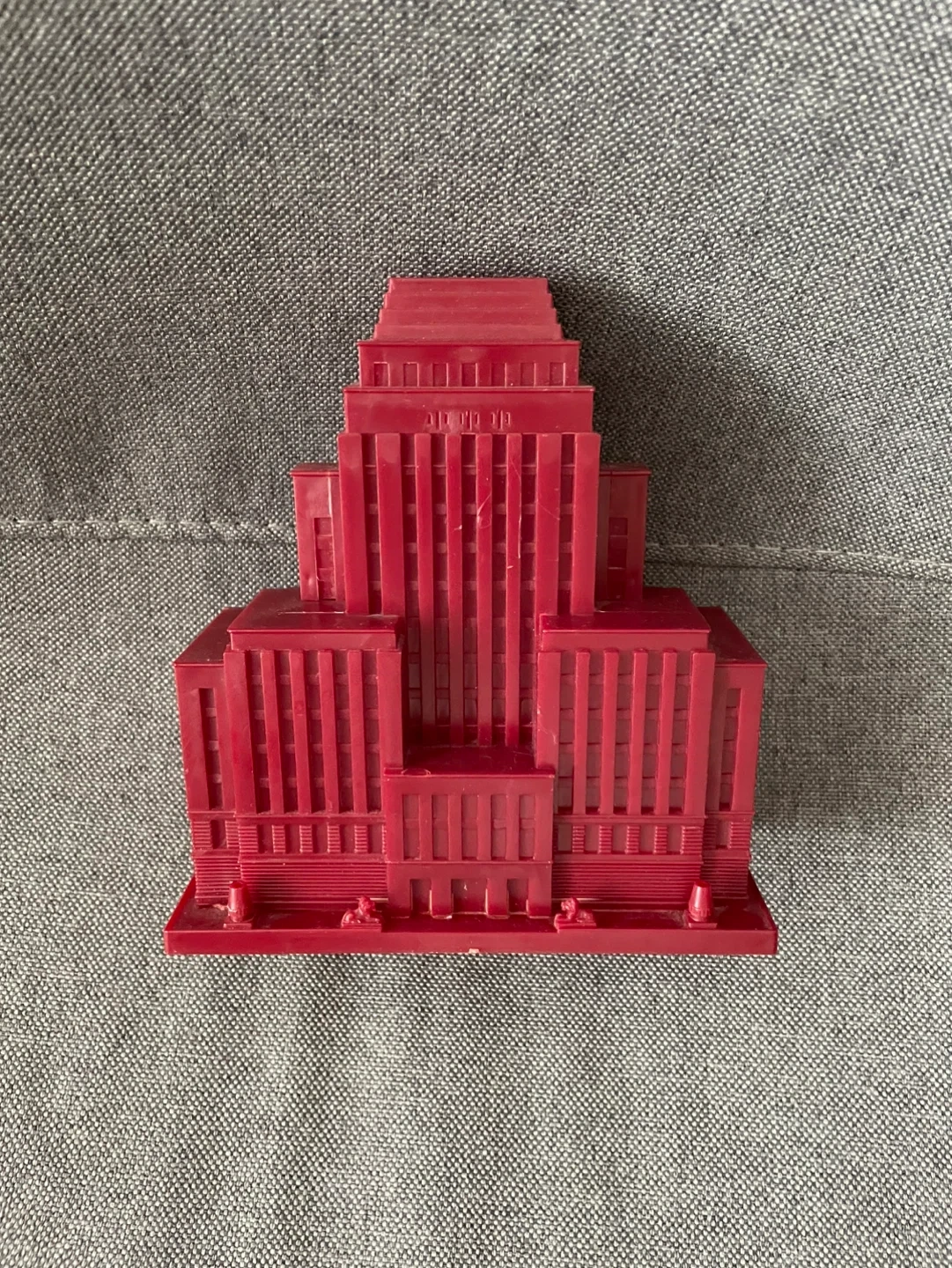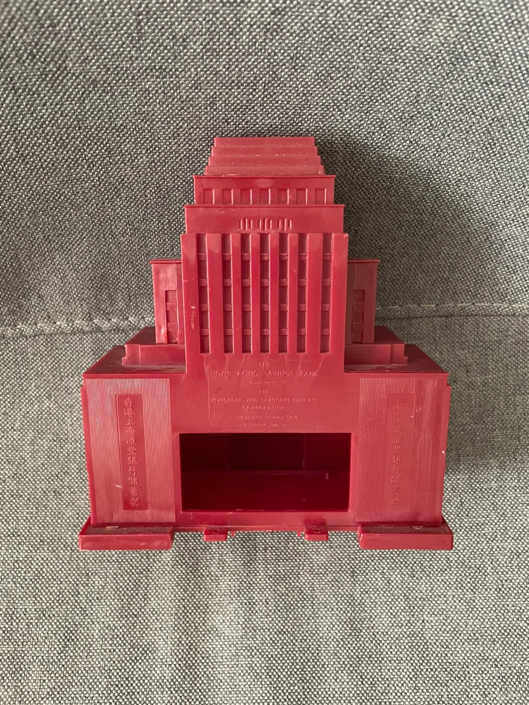 This is a red plastic model of HSBC Savings Bank building. It has a slot on the back, likely for use as a coin bank. Great for collectors or as a unique desk accessory!