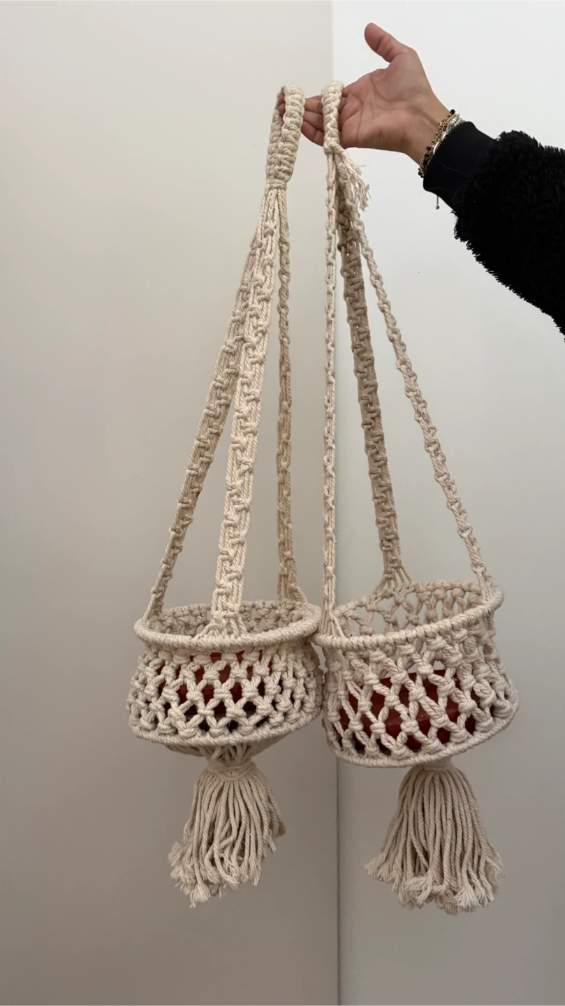Handmade macrame plant hangers, perfect for adding a bohemian touch to your space. feature tassels at the bottom. These hangers are designed to hold pots and can be hung from the ceiling or a wall mount. They add a lovely decorative element to any room!