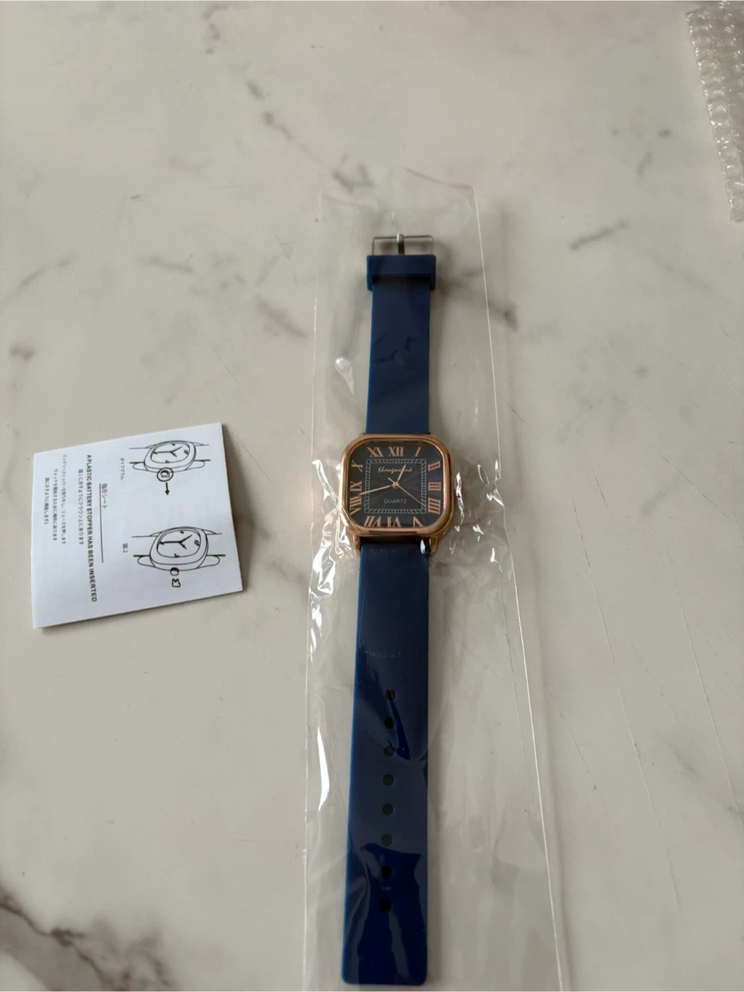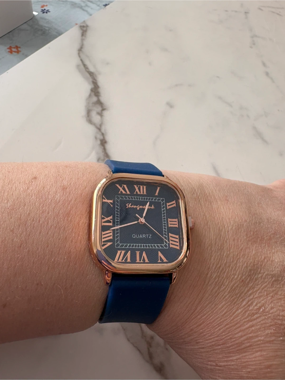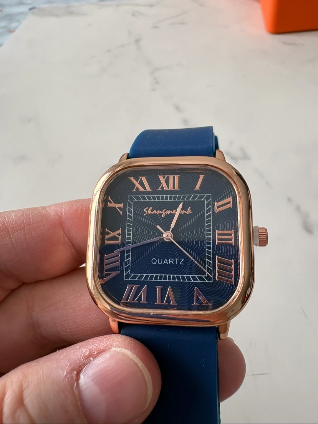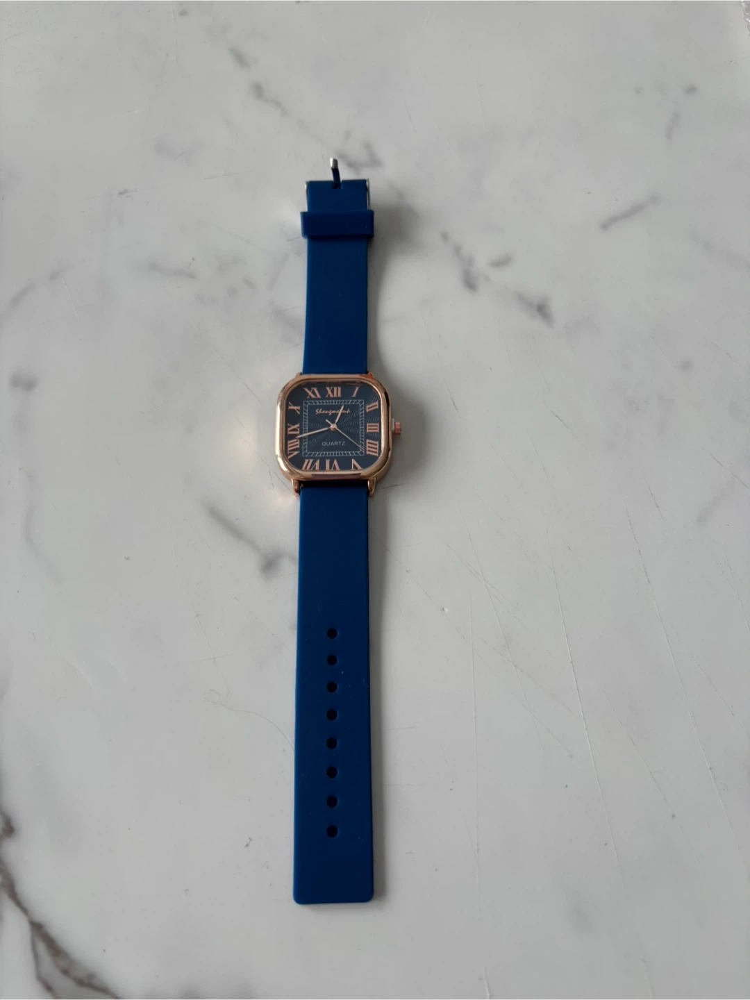 Elegant and modern women’s wristwatch featuring a navy blue silicone strap and rose gold square case. Designed with Roman numeral dial and quartz movement. Perfect for both everyday wear and classic outfits.