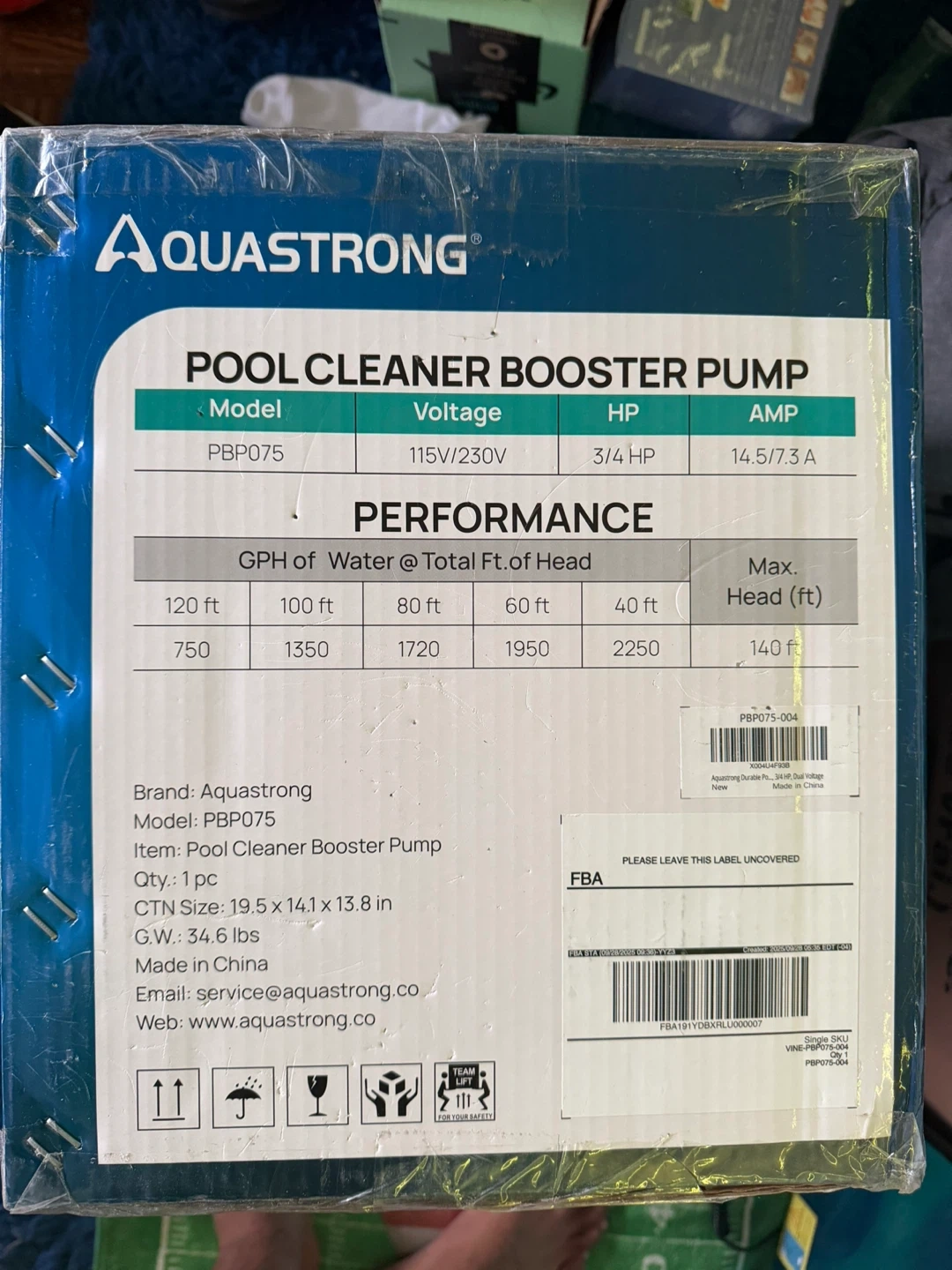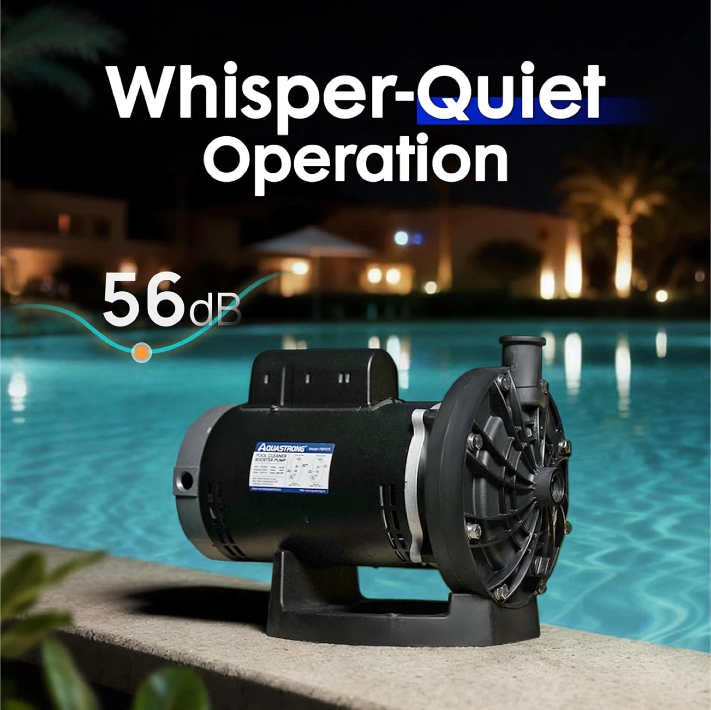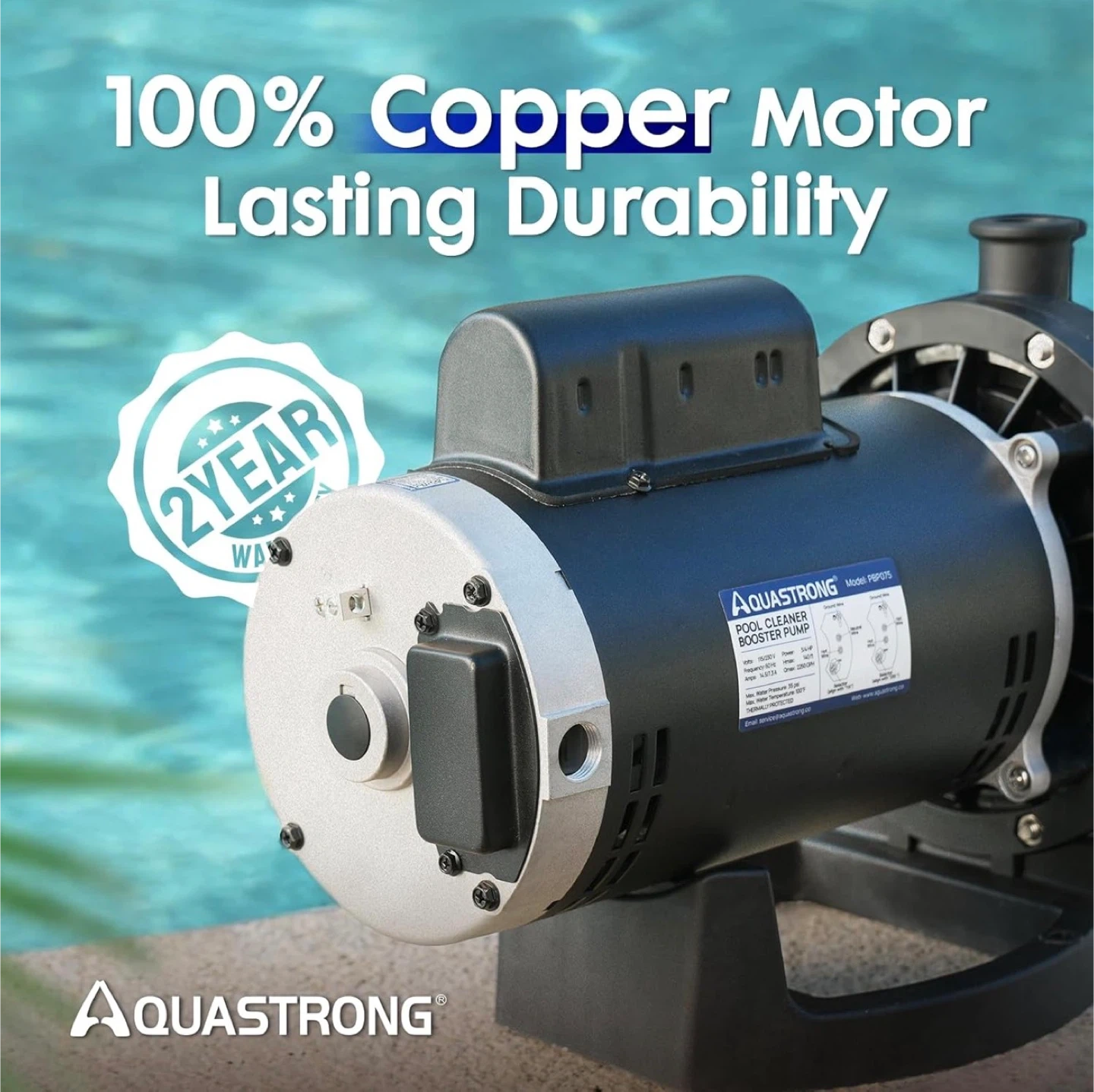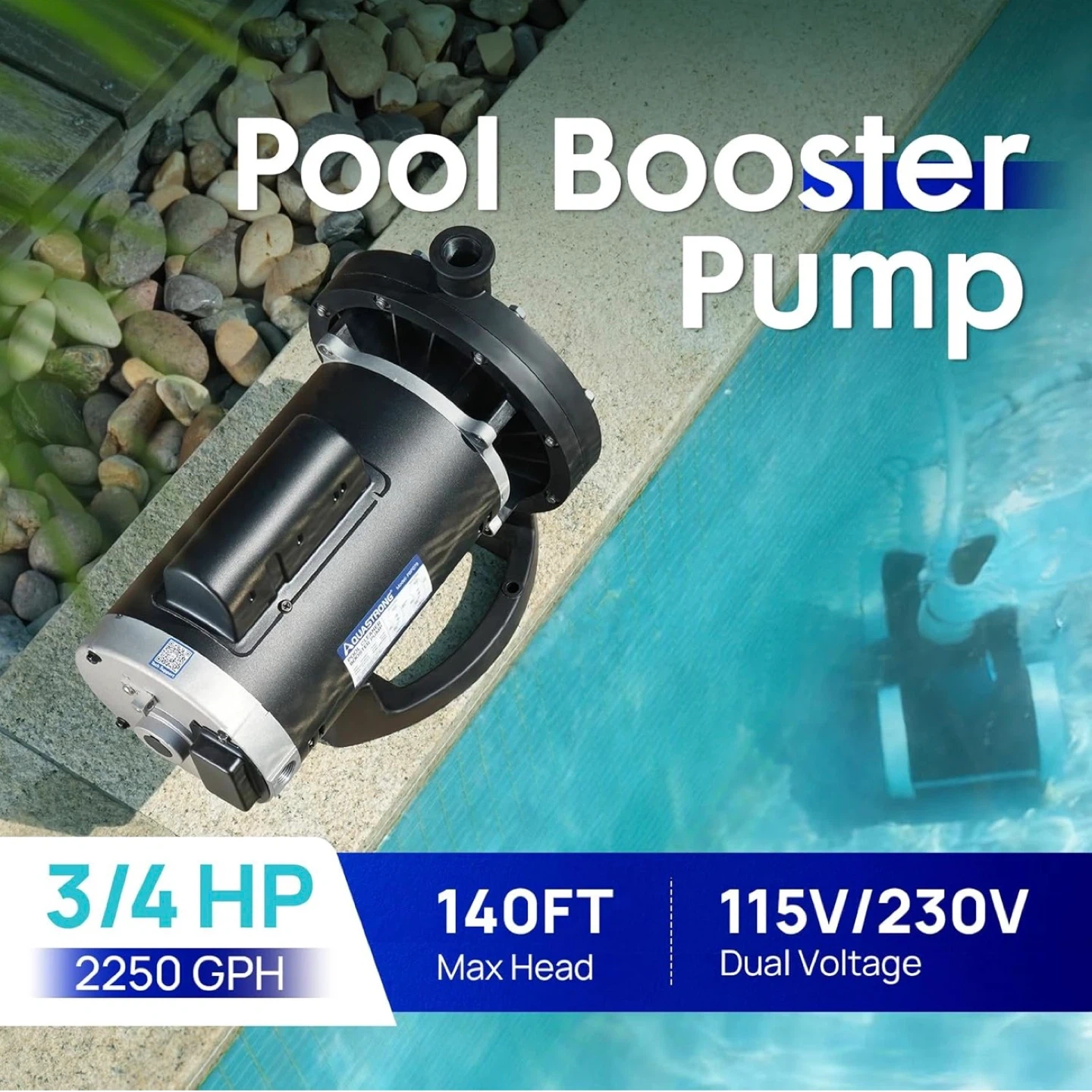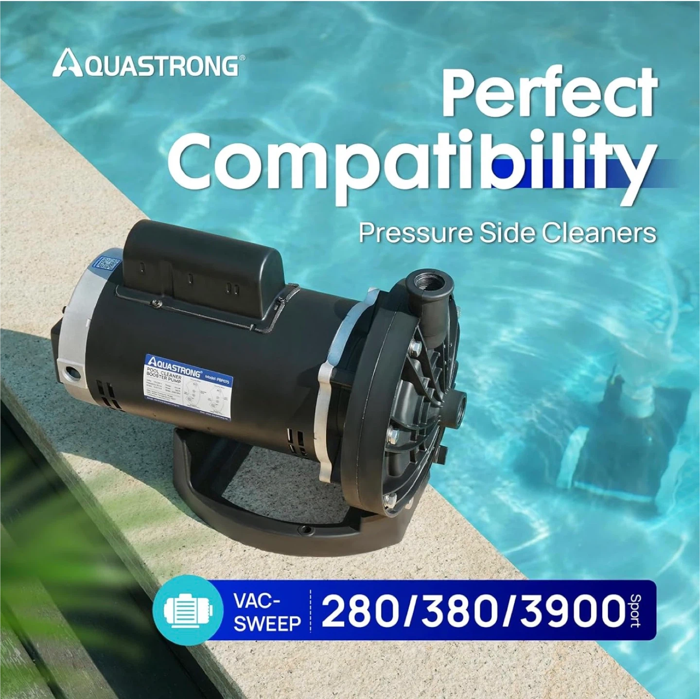 This AQUASTRONG pool booster pump has a 3/4 HP pure copper motor and dual voltage (115V/230V). It offers 140 ft max head and 2250 GPH. It's compatible with Vac-Sweep 280, 380, and 3900 pressure-side pool cleaners.
