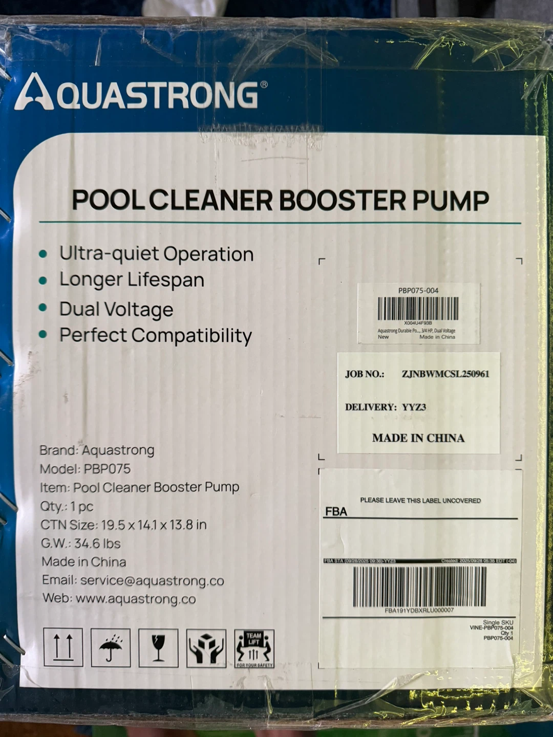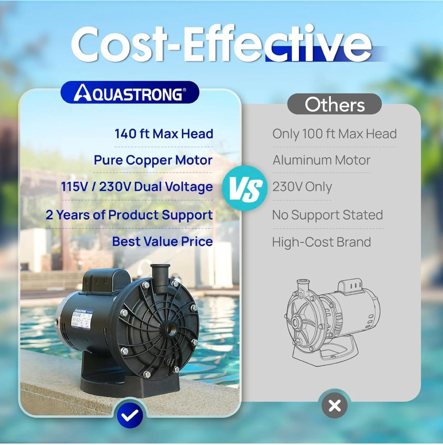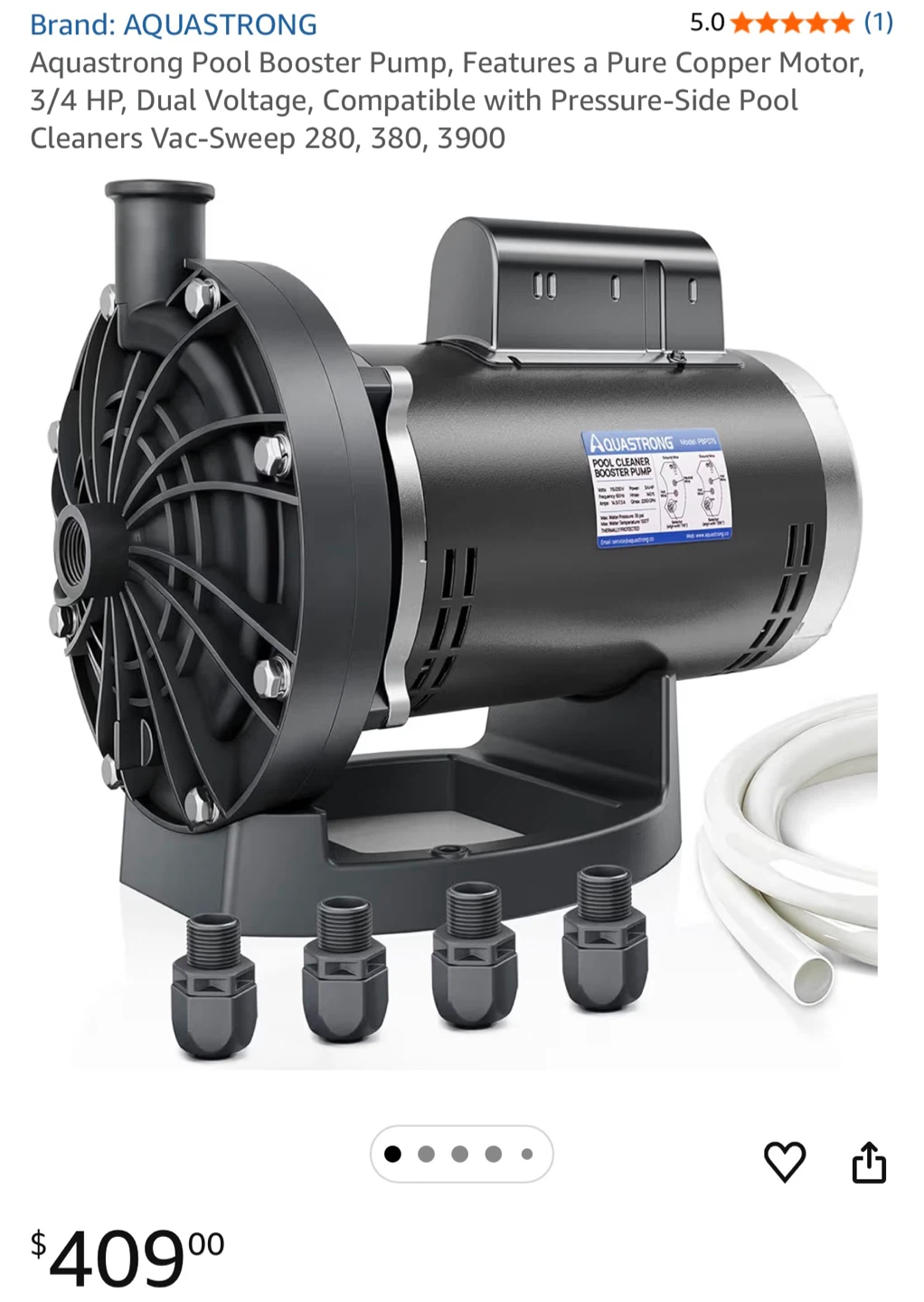 This AQUASTRONG pool booster pump has a 3/4 HP pure copper motor and dual voltage (115V/230V). It offers 140 ft max head and 2250 GPH. It's compatible with Vac-Sweep 280, 380, and 3900 pressure-side pool cleaners.