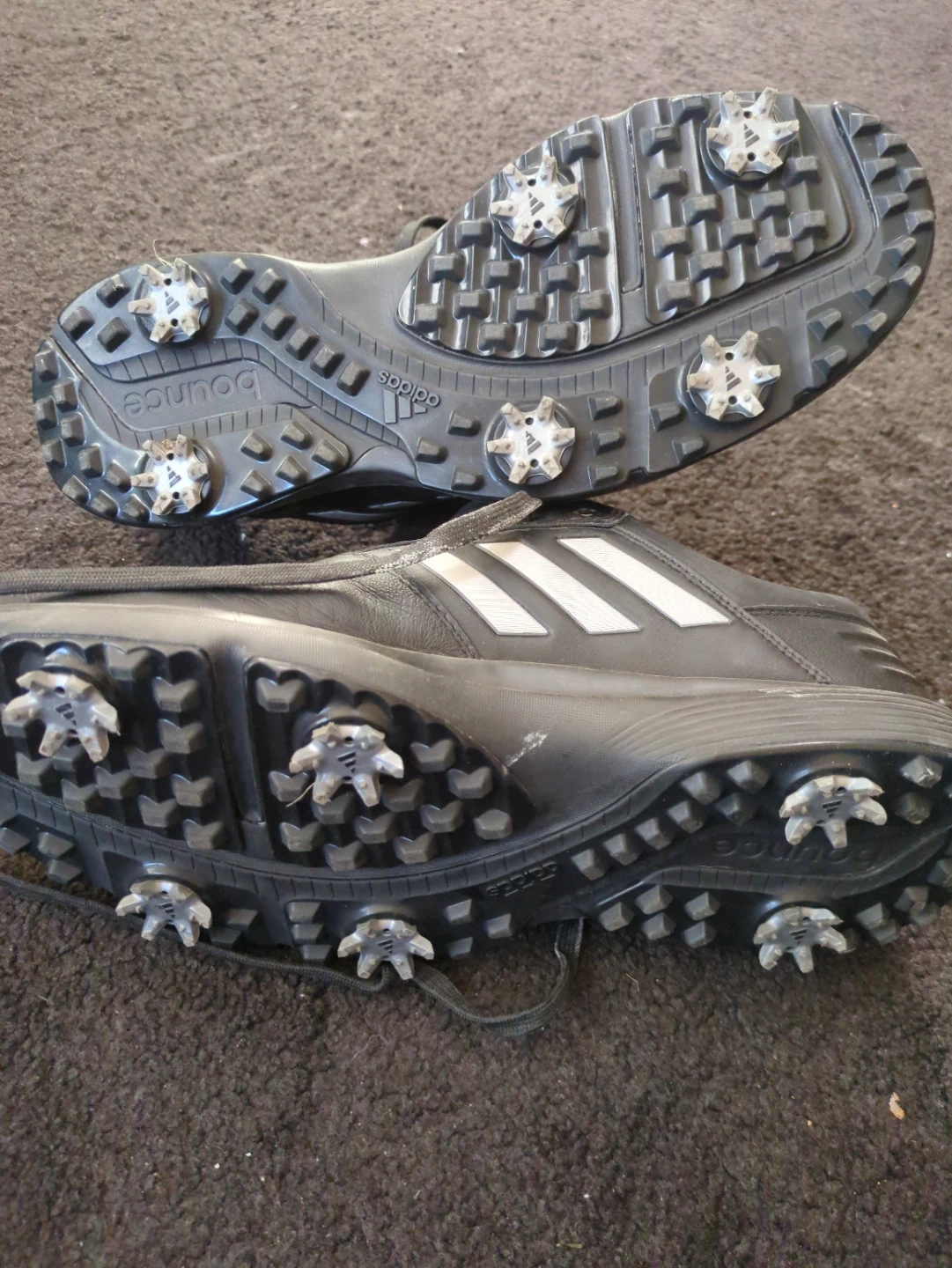 Selling a pair of Adidas golf shoes in size 12. They're in good condition and ready for the green. The shoes feature the classic Adidas three-stripe design.