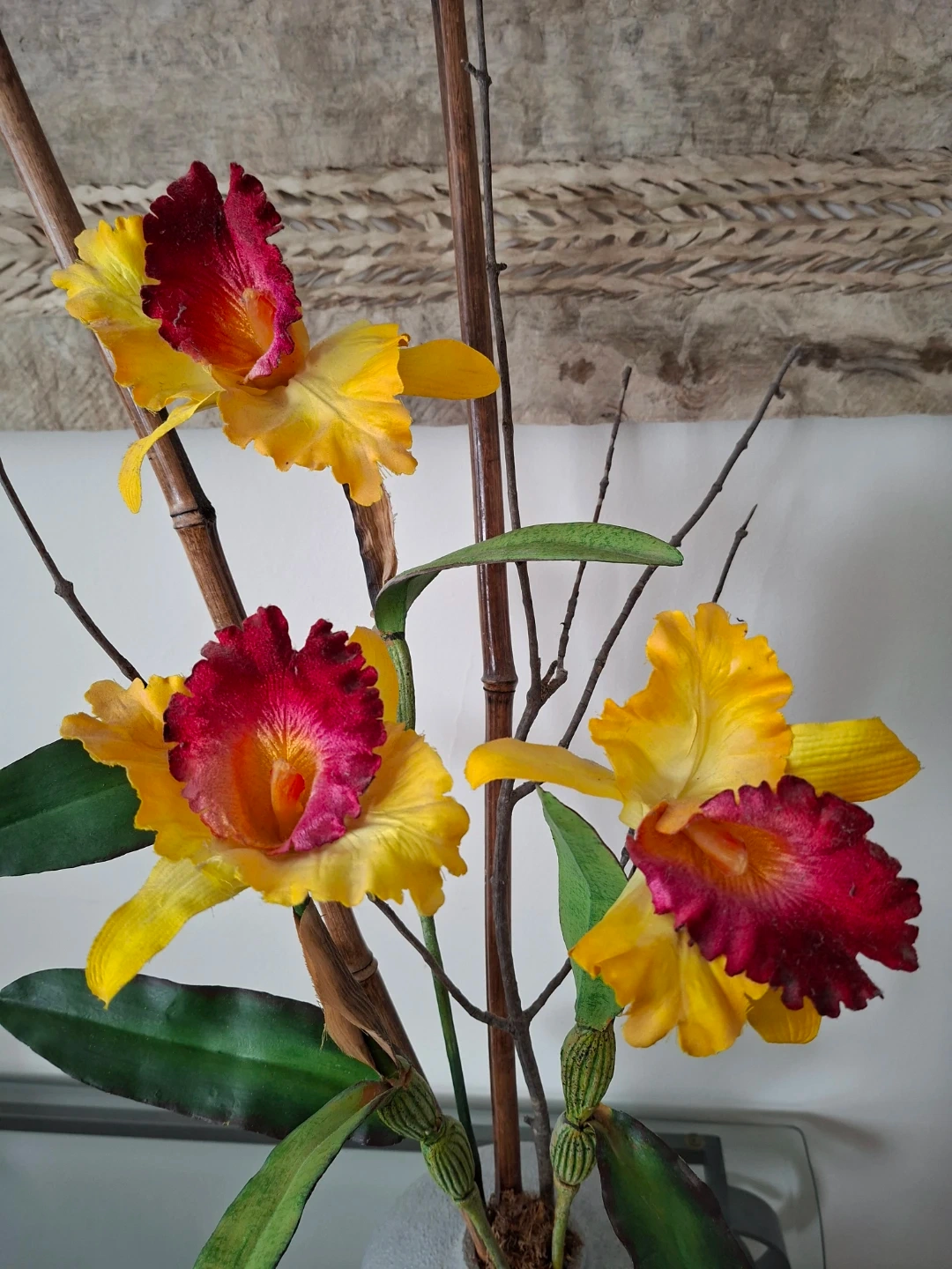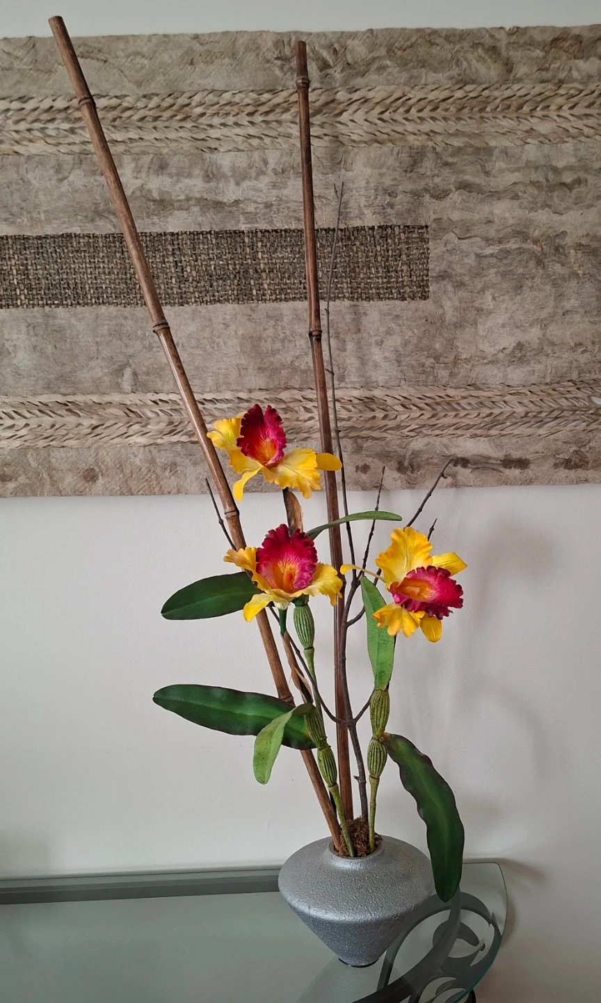 Beautiful silk orchid arrangement with yellow and red blooms. Comes in a grey textured vase with bamboo stems and green leaves. Adds a touch of elegance to any room!