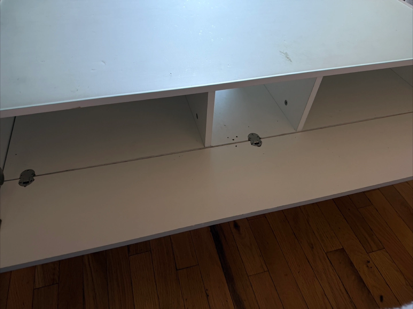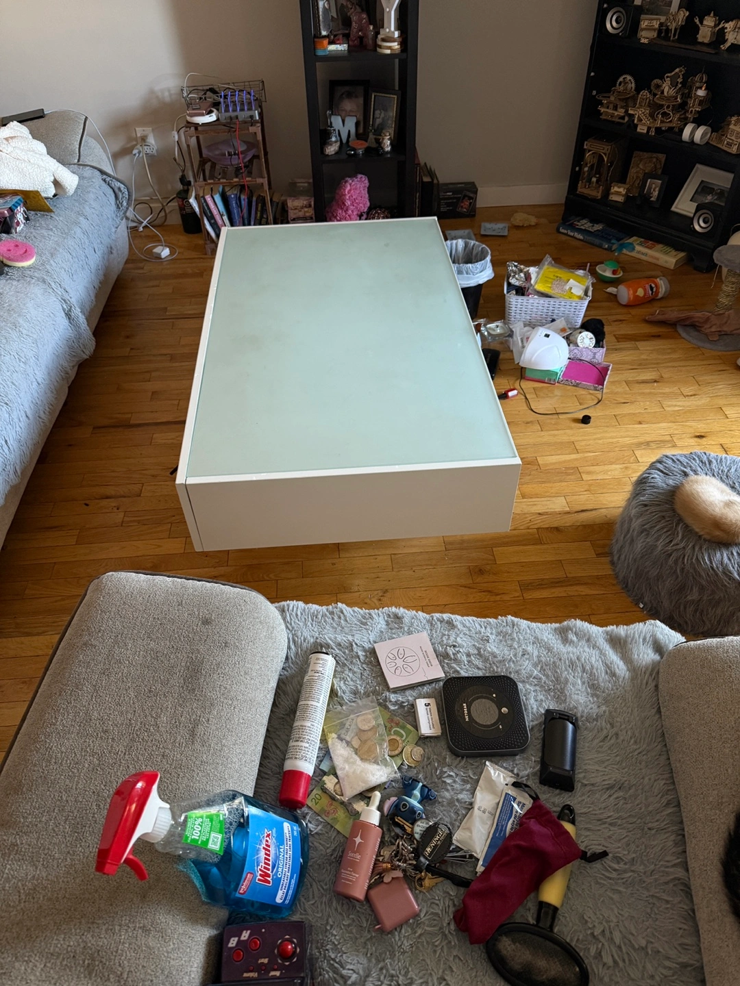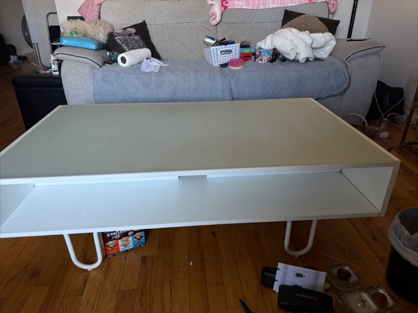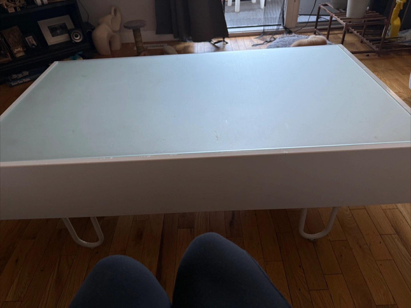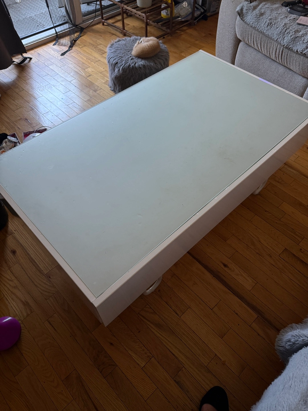 Selling a coffee table in white. With frosted glass top. It has a sleek design and offers some storage space underneath the top surface. It's perfect for a living room or entertainment area. It's in good condition and ready for a new home