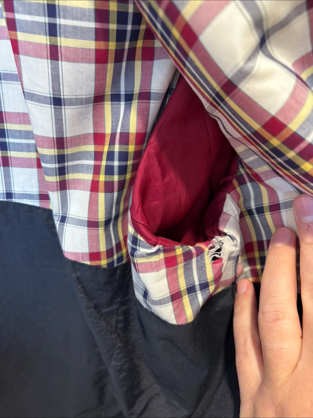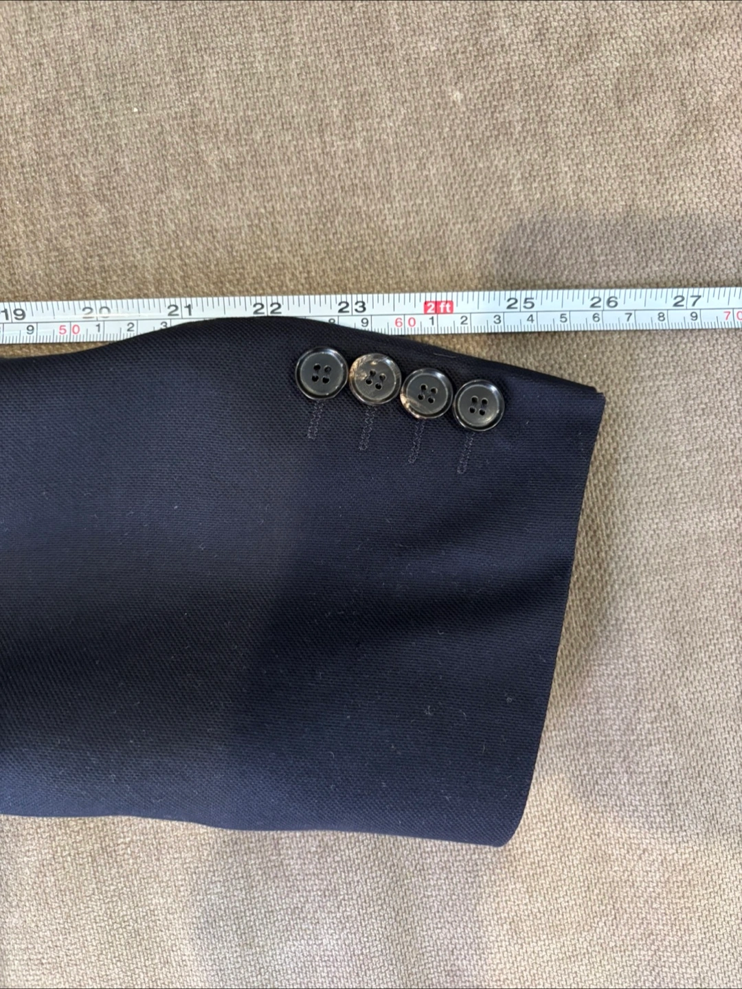 Has some wear in the left armpit lining but looks great. Still has original garment bag