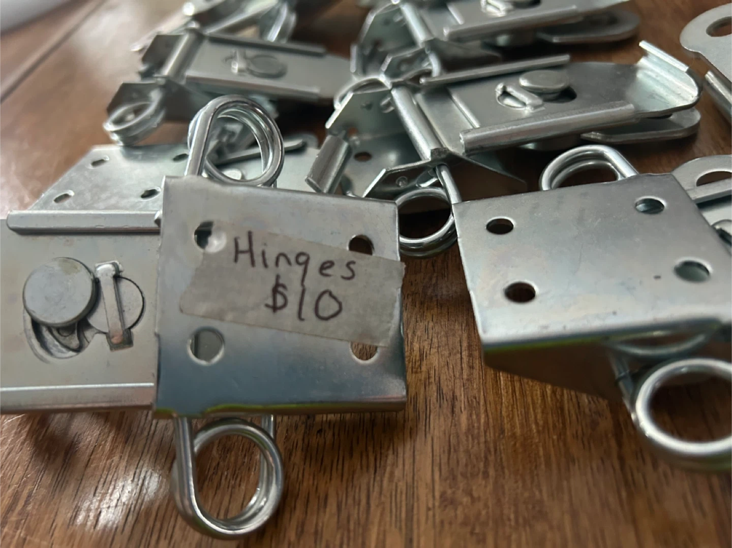 This is a lot of 10 metal hinges. They're made of galvanized steel and have a swivel closure. Perfect for toolboxes, chests, or custom builds!