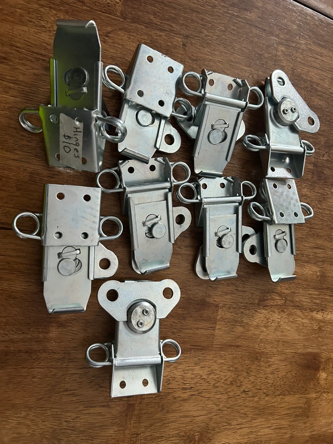 This is a lot of 10 metal hinges. They're made of galvanized steel and have a swivel closure. Perfect for toolboxes, chests, or custom builds!
