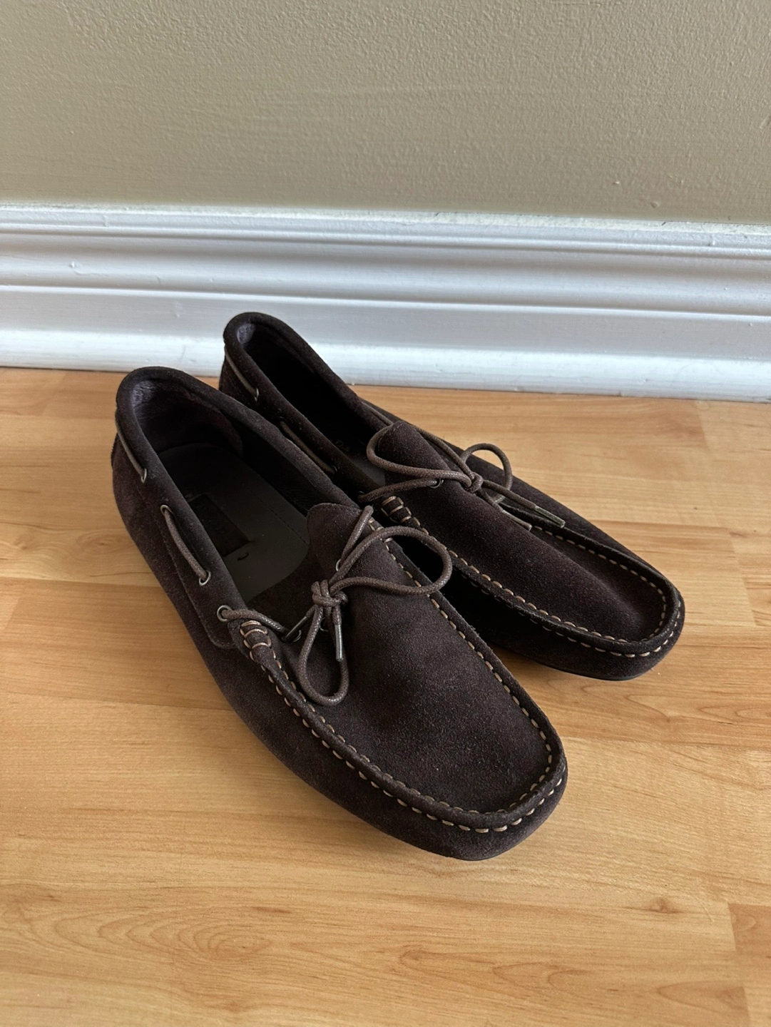 Pair of Massimo Dutti men's dark brown suede driving shoes. Lace-up closure. Suede upper. Rubber sole. Good condition. Price is firm. Pick up near Scarborough Town Centre.
