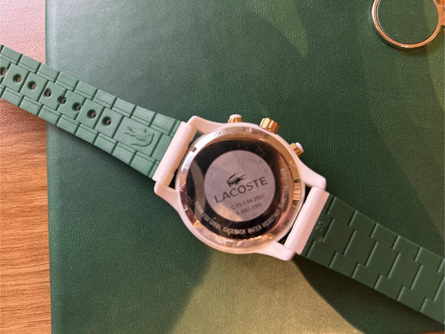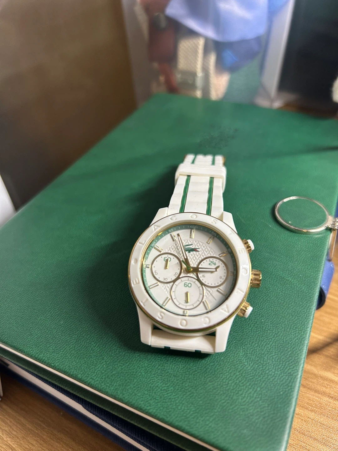 Selling a stylish Lacoste sporty watch in white,green and gold. It has been well maintained and only few time used, so it looks still pretty new. The watch features a chronograph dial and a comfortable silicone strap.