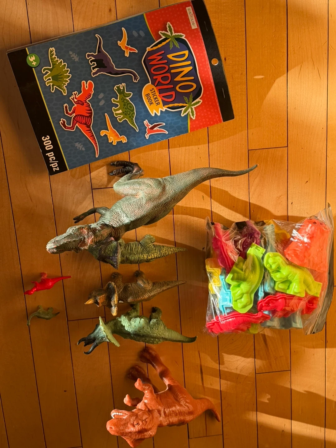 This set includes a "Dino World" sticker book with 300 pieces and a collection of toy dinosaurs. The sticker book is recommended for ages 3+. Perfect for young dinosaur enthusiasts to create their own prehistoric scenes!