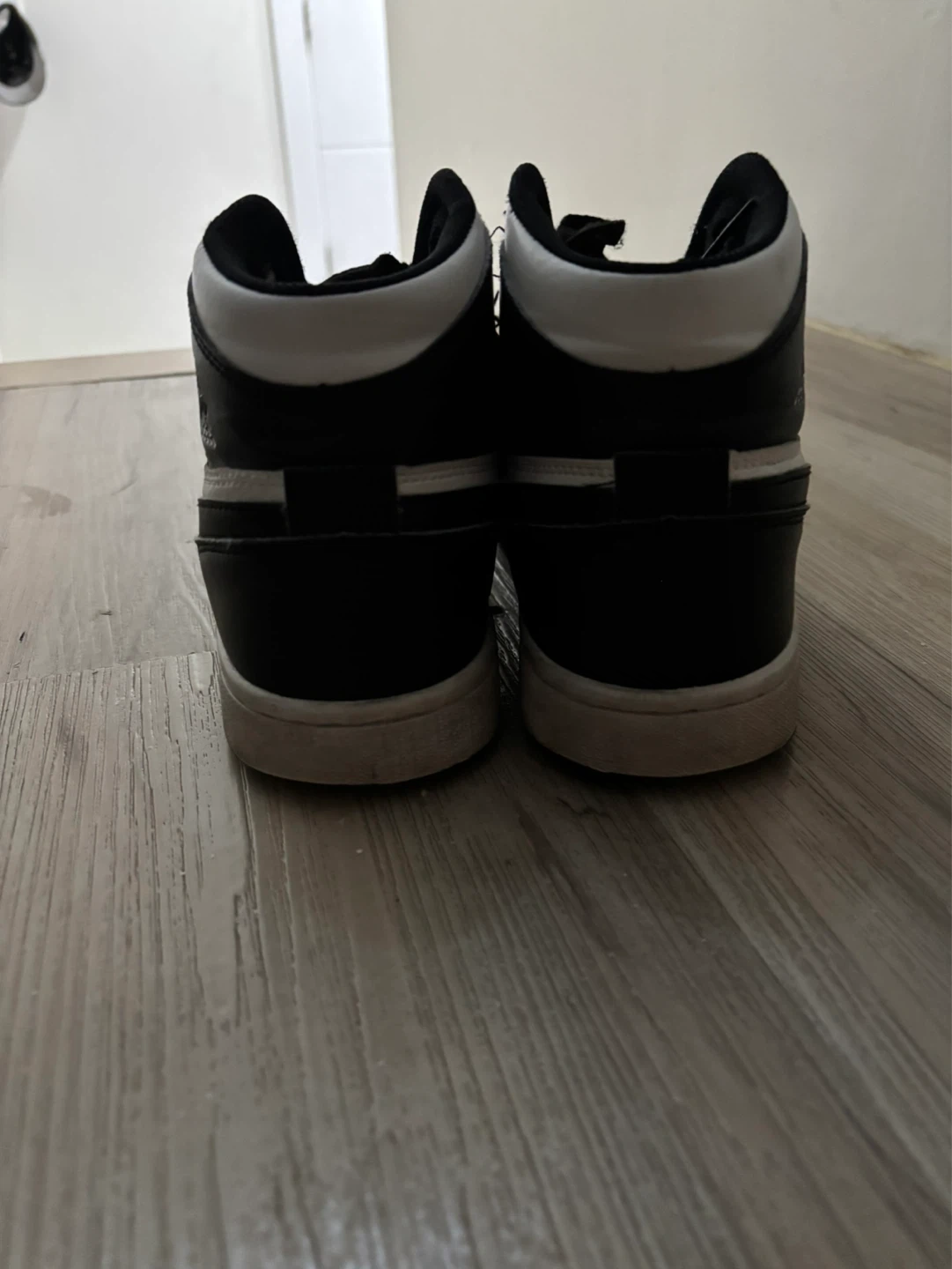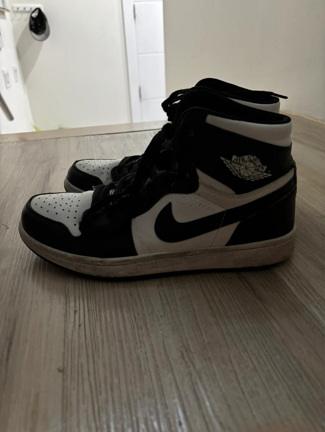 Classic black and white Air Jordan 1 high-top sneakers. Features the iconic Jumpman logo and perforated toe box. Leather construction for durability. Size 7 US