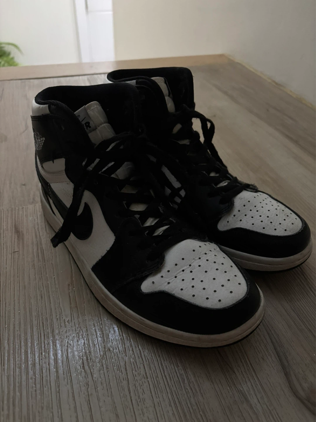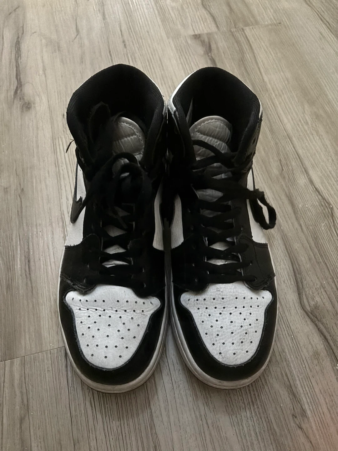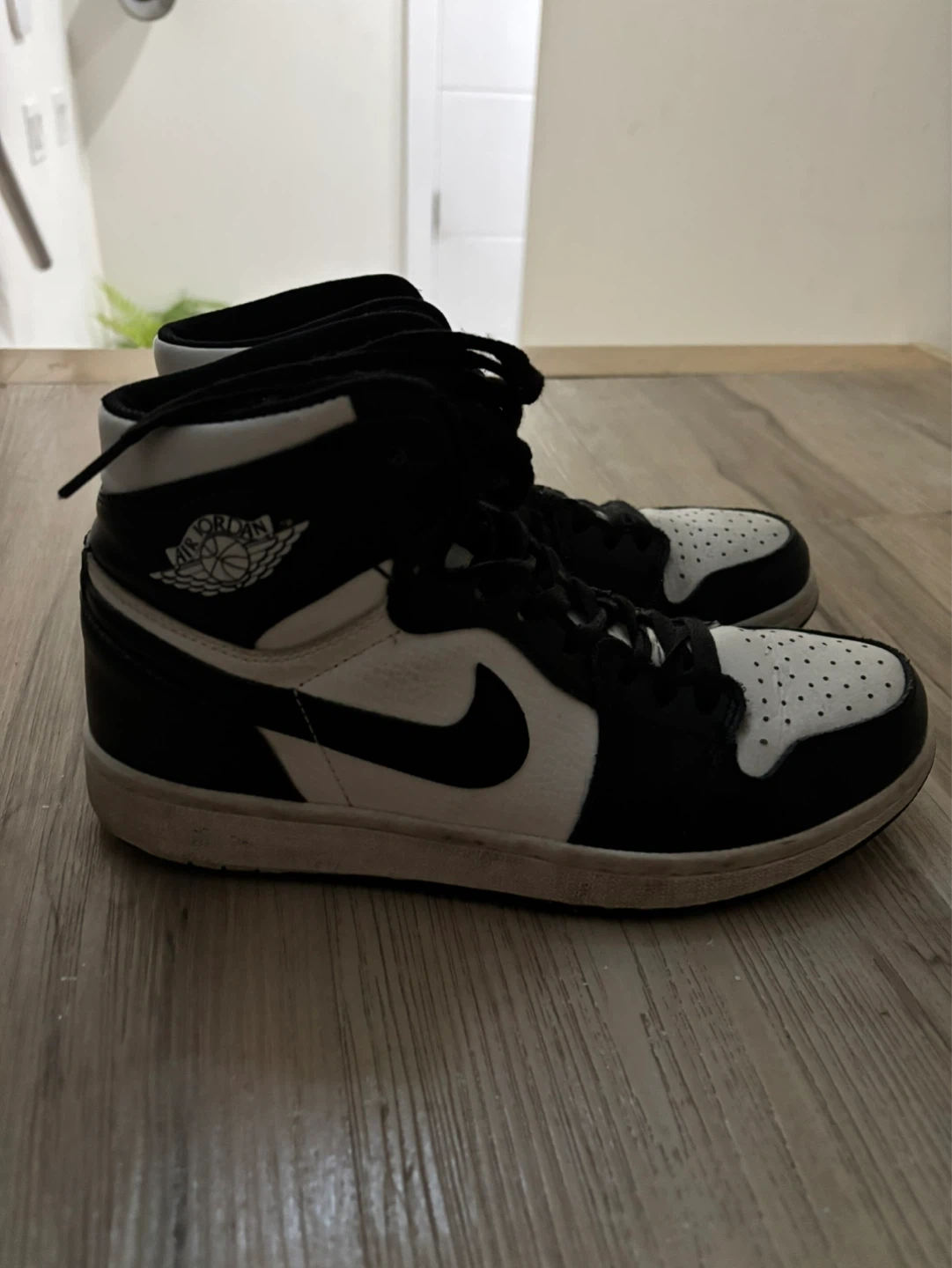 Classic black and white Air Jordan 1 high-top sneakers. Features the iconic Jumpman logo and perforated toe box. Leather construction for durability. Size 7 US