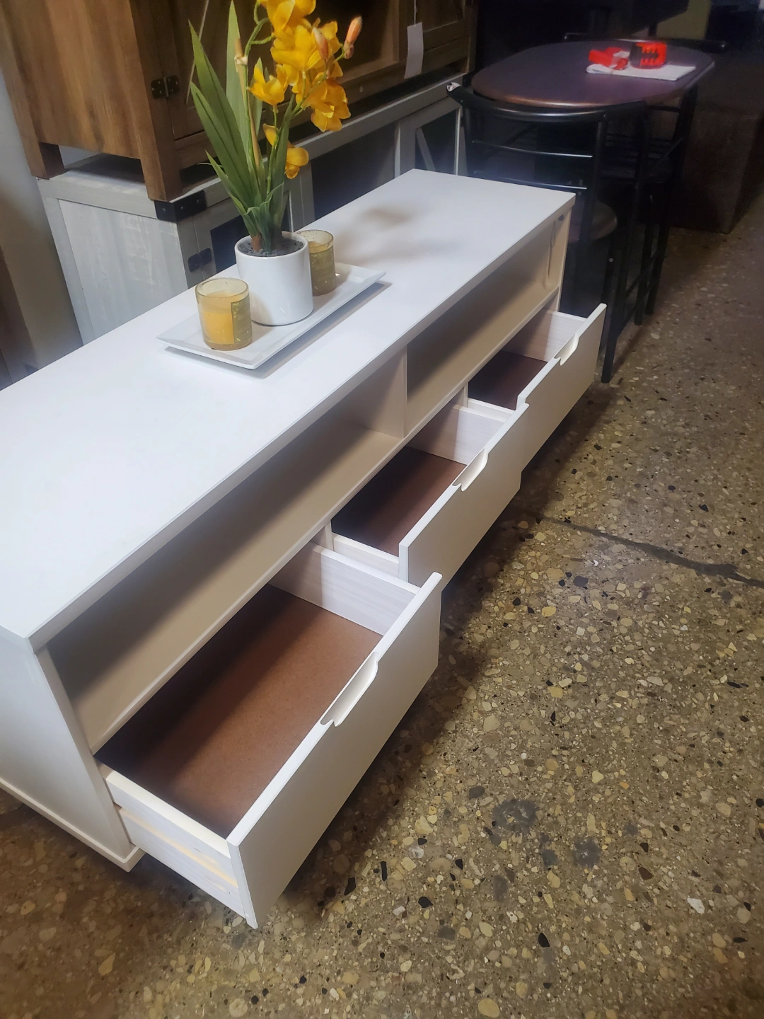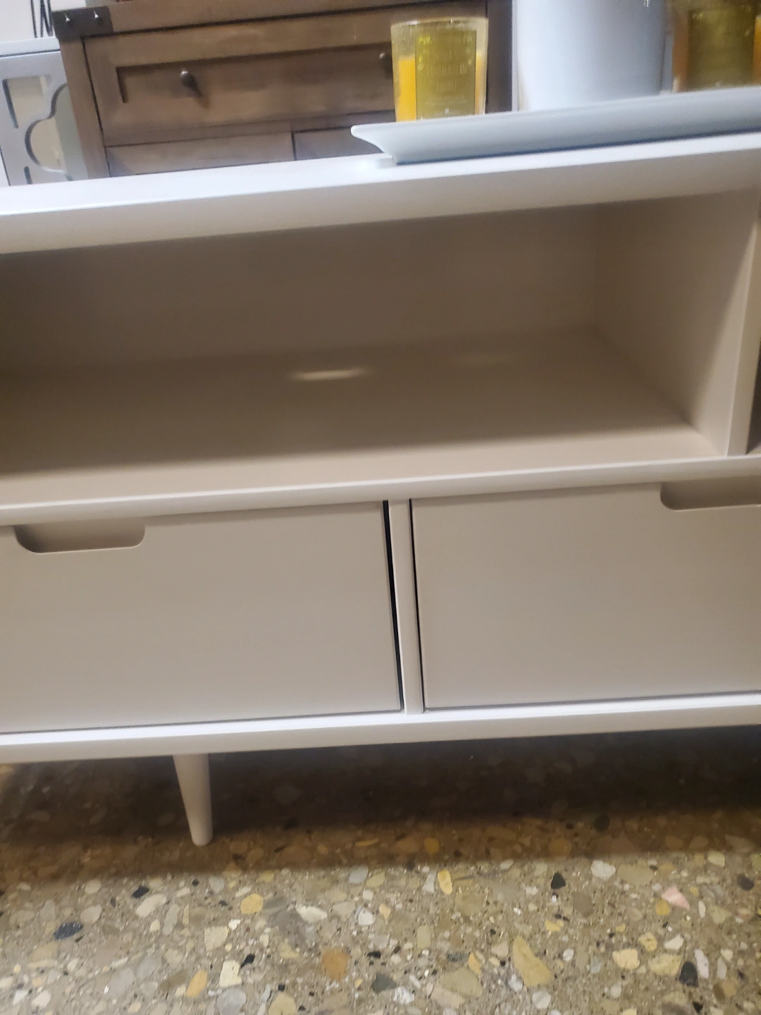 Can support up TV to a 64-inch - With slightly tapered legs, this 58-inch TV stand features a Mid Century Modern silhouette to complement your home’s aesthetic. Crafted of solid wood to showcase a beautiful, natural grain-stained finish for a warm texture to your living room. With 3 easy to access drawers featuring cutout handles, 2 open shelves above, and cord management to organize your electronics. This TV stand can also be incorporated in your bedroom as a storage cabinet or in your kitchen as a buffet due to its versatile design. Providing additional storage space in your home for the essentials you love most, from your favorite movies to your book collection and family photos.DIMENSIONS: 24" H X 58" L X 16" W