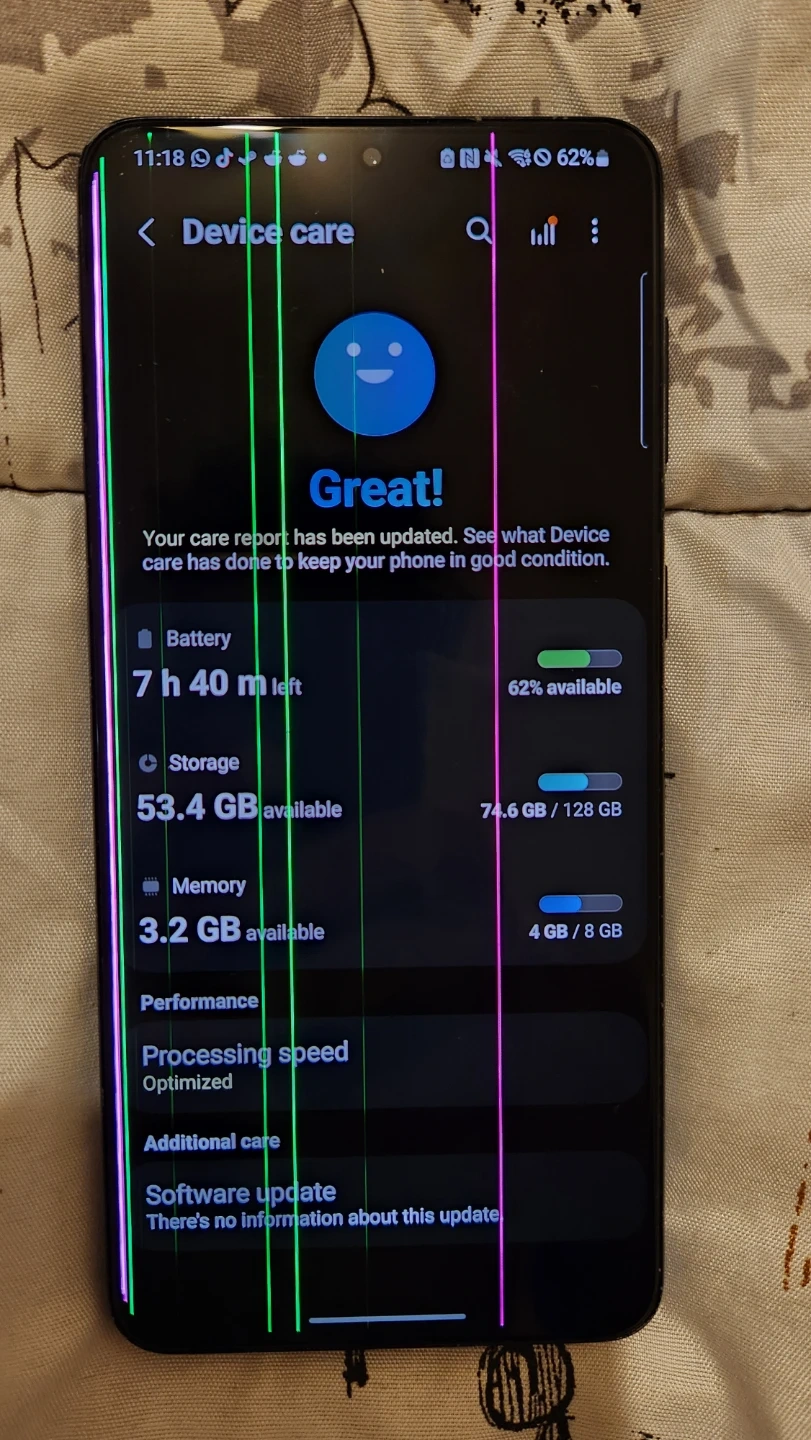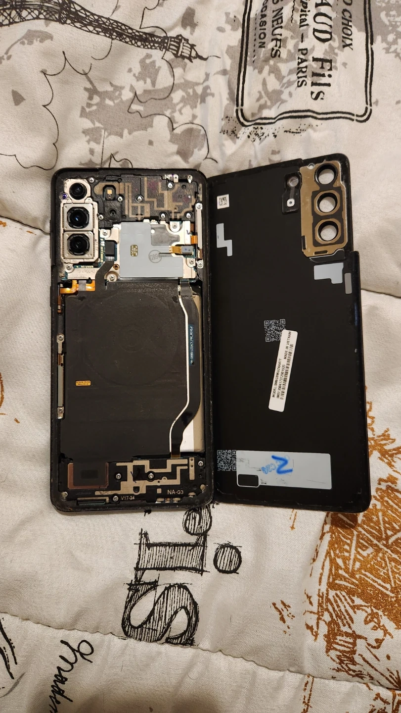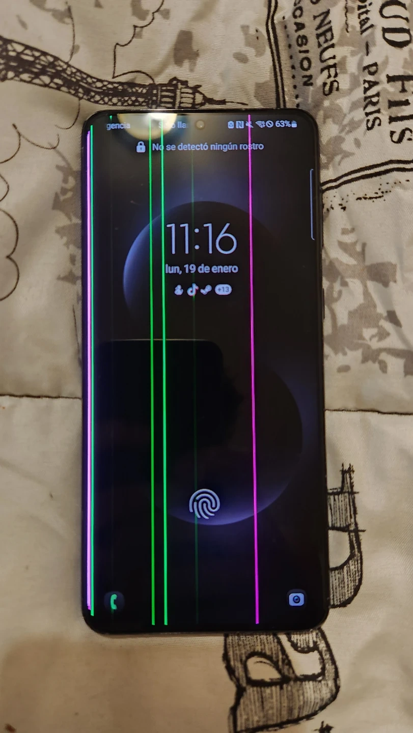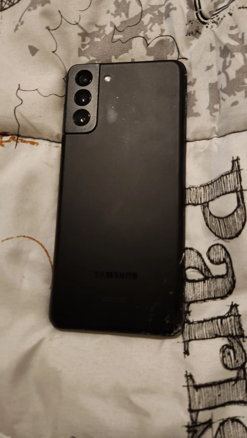 Samsung Galaxy S21+ 5G smartphone. It's black and has 128GB of storage. The screen displays vertical lines. The screen is In good condition except the Lines, everything works fine maybe if you want it for parts.
