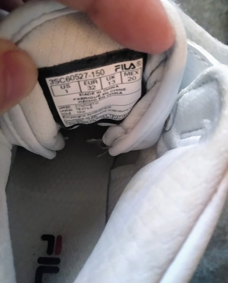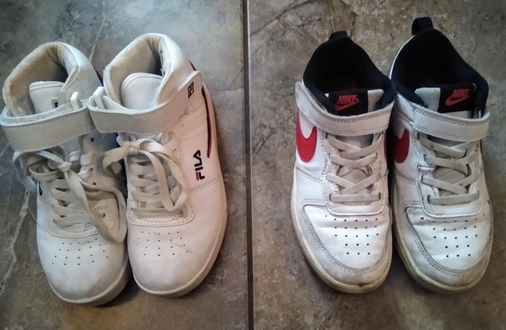 Two pairs of all-leather Size 1 white running shoes in excellent used condition. One pair hi-cut Fila $25.
