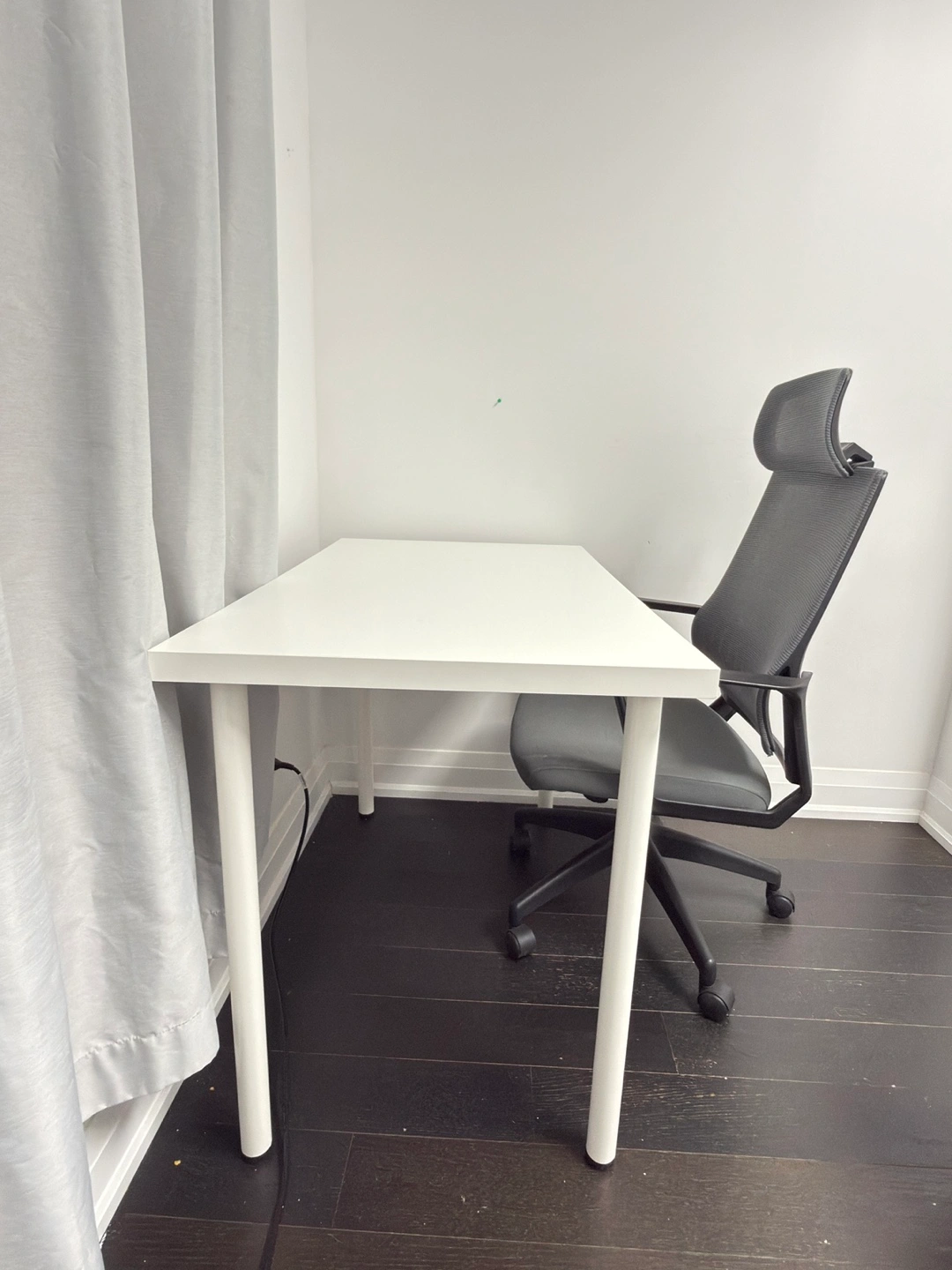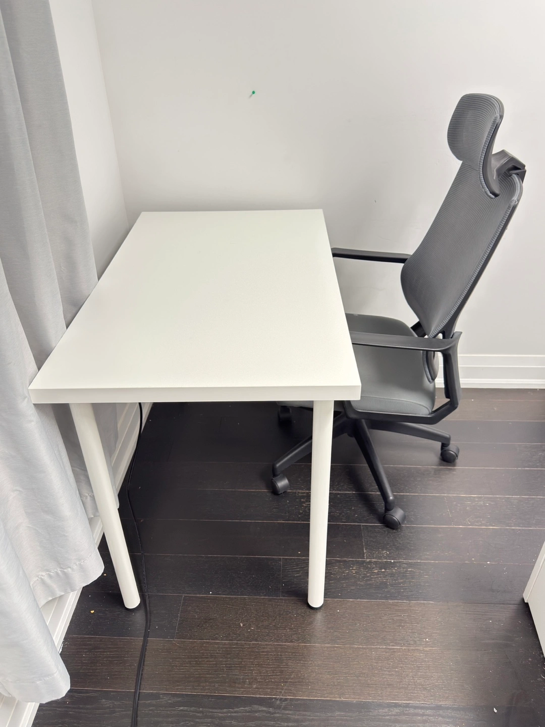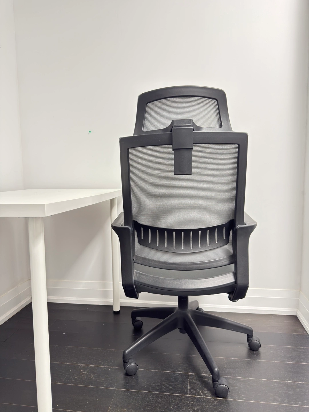 This is a grey mesh office chair with a headrest. It features a durable mesh back and seat for breathability. The chair's base has wheels for easy mobility. It's suitable for a home office setup.