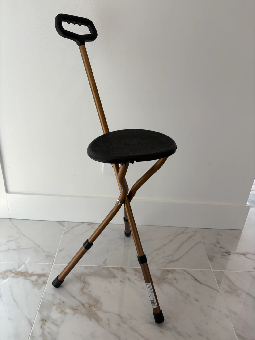 Never used; lightweight folding cane seat by Drive Medical provides a sturdy support cane when closed and a comfortable seat to rest on when open. It's lightweight, weighing just 1.3 lbs, and can withstand a weight capacity of 250 lbs. The adjustable height cane can be customized to meet your needs and make walking a more enjoyable experience. Originally bought for $57.57