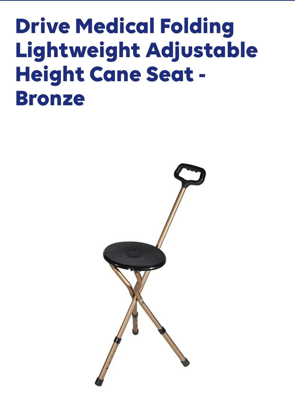 Never used; lightweight folding cane seat by Drive Medical provides a sturdy support cane when closed and a comfortable seat to rest on when open. It's lightweight, weighing just 1.3 lbs, and can withstand a weight capacity of 250 lbs. The adjustable height cane can be customized to meet your needs and make walking a more enjoyable experience. Originally bought for $57.57