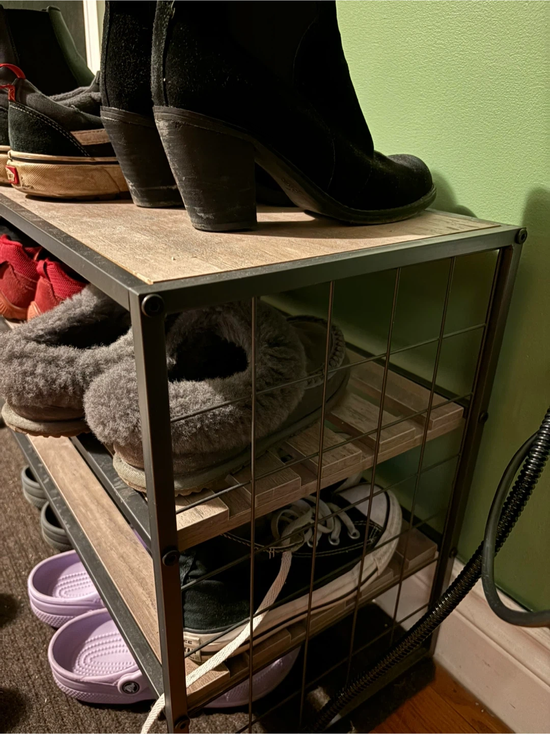 Selling this Mainstays 3-tier shoe rack with greyish metal sides and brown-grey shelves. Its size is 30 in. W x 12 in. D x 18 in. H. It’s in great condition and we’re only selling it because we’re replacing it with a shoe rack that has a cushion top. I added the online Walmart picture to allow you to see it in a different light. Let me know if you have any questions or offers!