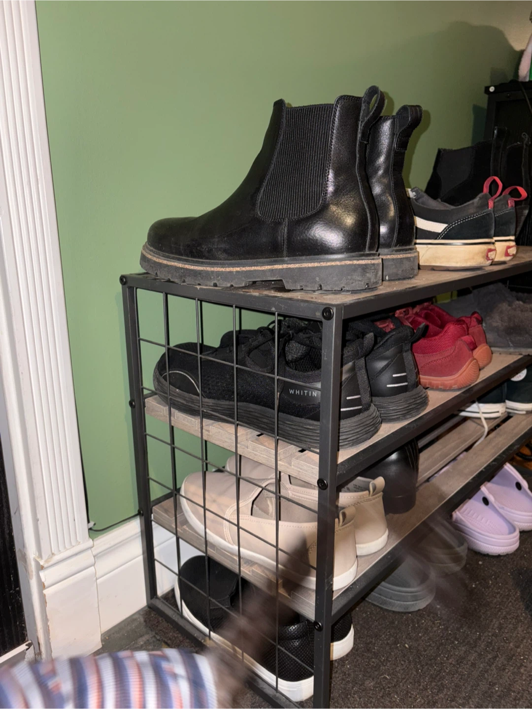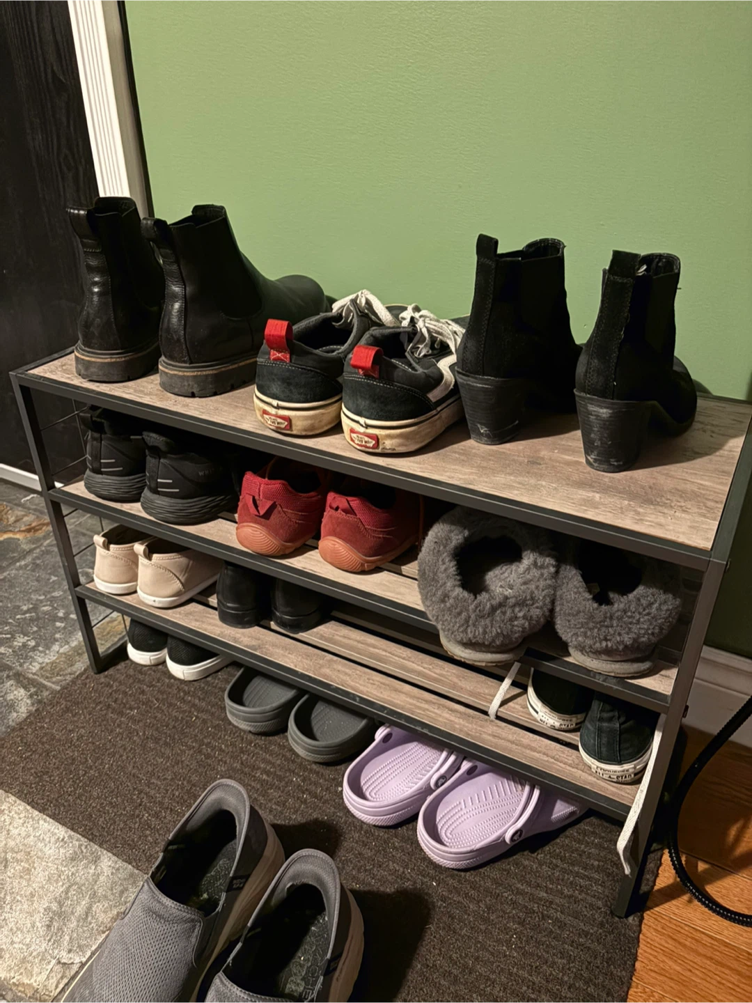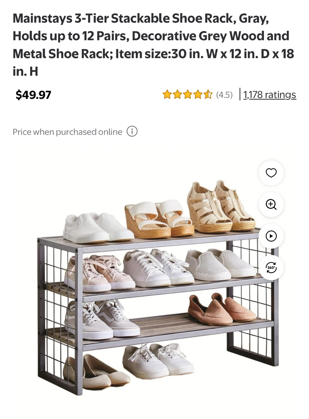 Selling this Mainstays 3-tier shoe rack with greyish metal sides and brown-grey shelves. Its size is 30 in. W x 12 in. D x 18 in. H. It’s in great condition and we’re only selling it because we’re replacing it with a shoe rack that has a cushion top. I added the online Walmart picture to allow you to see it in a different light. Let me know if you have any questions or offers!