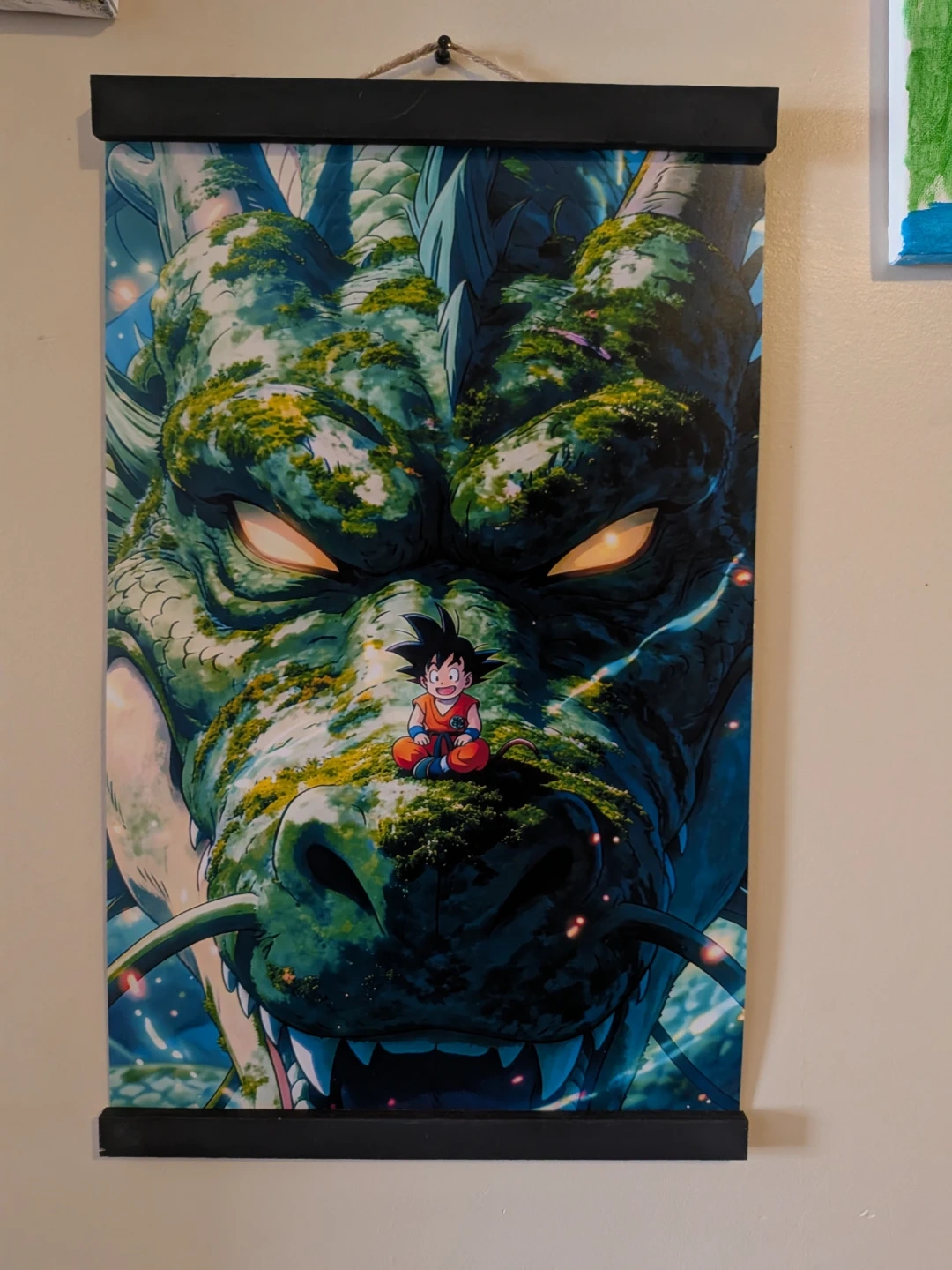 A vibrant wall scroll featuring Shenron with a small Goku sitting on its nose. It's a great piece for any Dragon Ball fan's room. The scroll includes a black top and bottom bar for hanging.