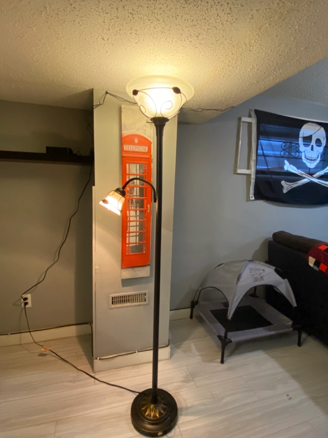 Tall dark bronze floor lamp. Features a large top shade and a smaller adjustable reading lamp. Excellent for living rooms or bedrooms.