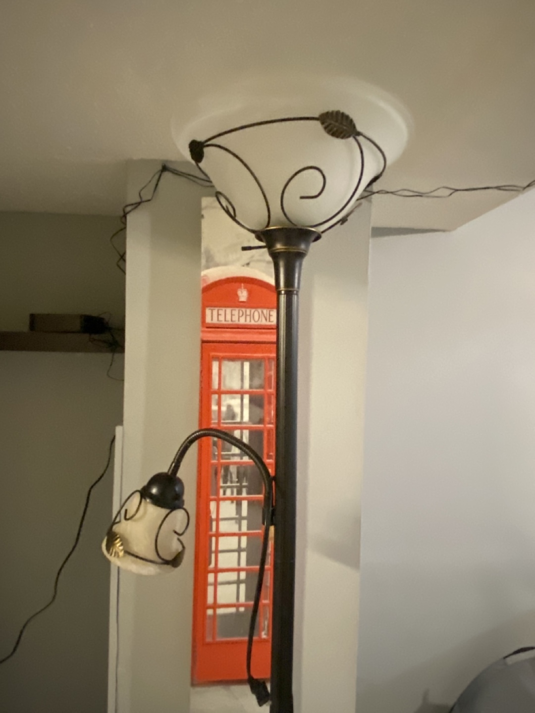 Tall dark bronze floor lamp. Features a large top shade and a smaller adjustable reading lamp. Excellent for living rooms or bedrooms.