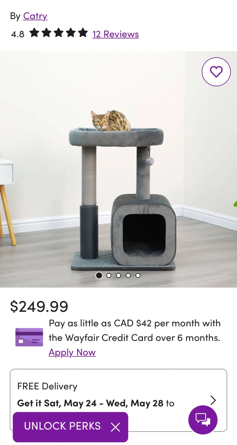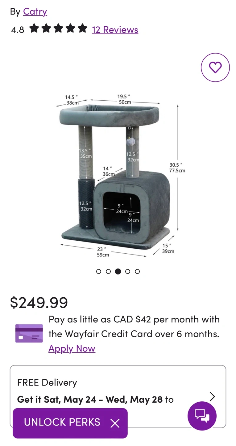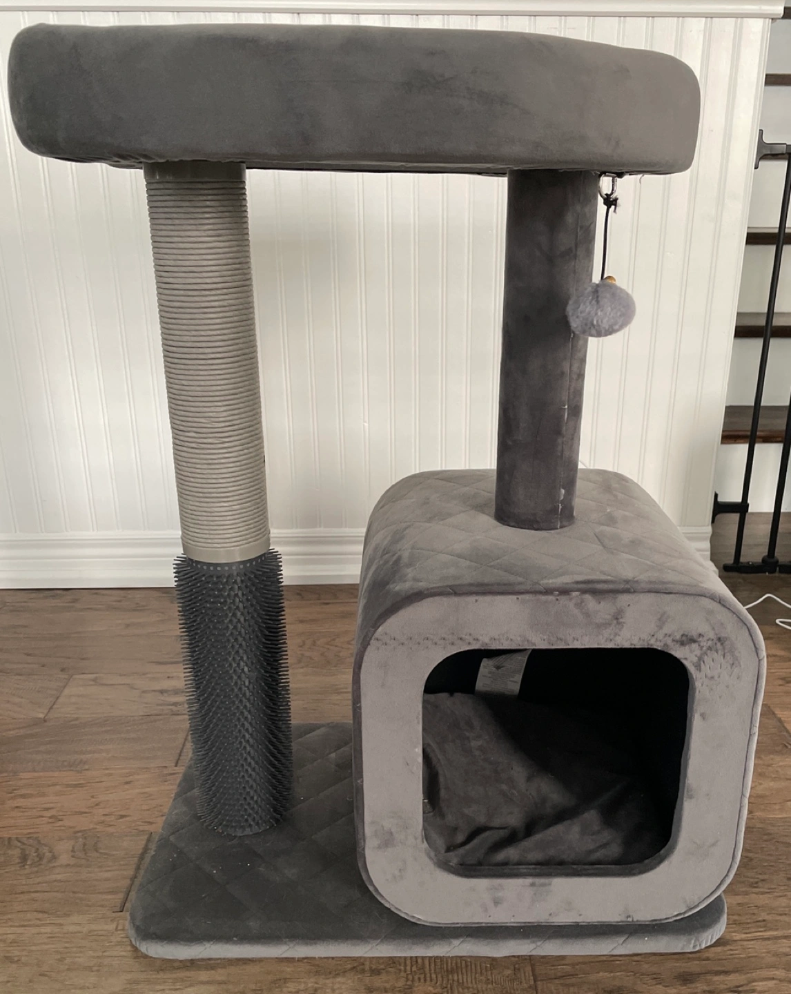 Grey cat tree, two posts, small condo, top platform. Excellent for kittens and small to medium-sized cats. Durable and stylish.