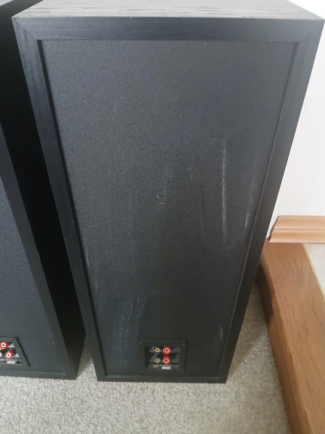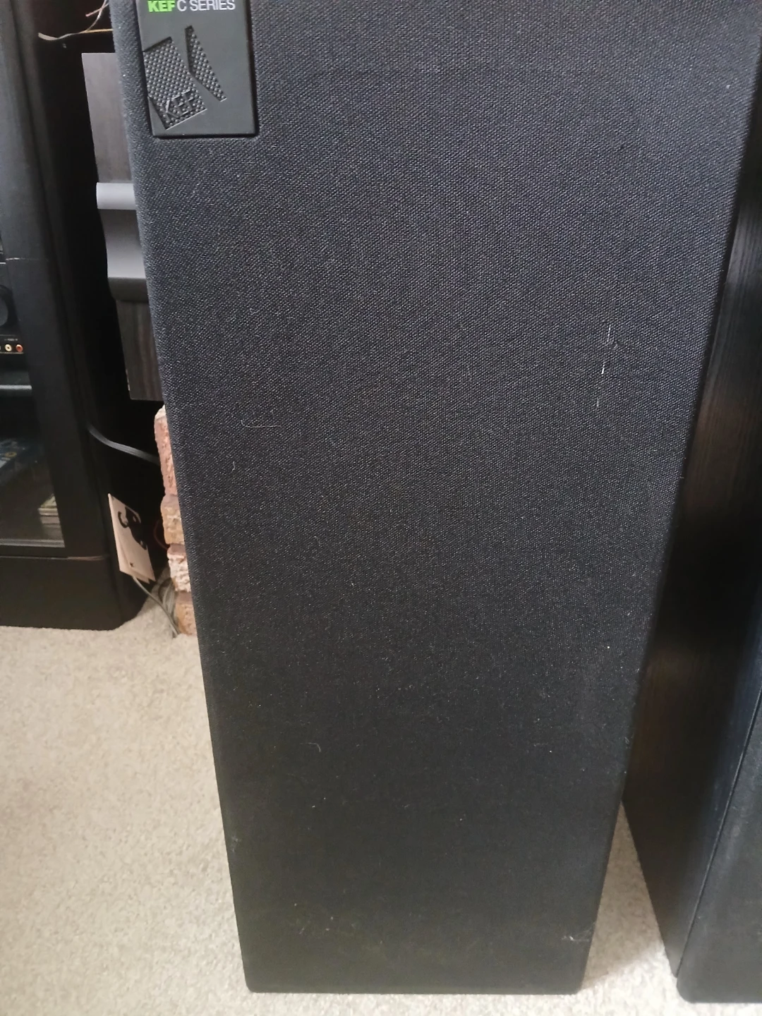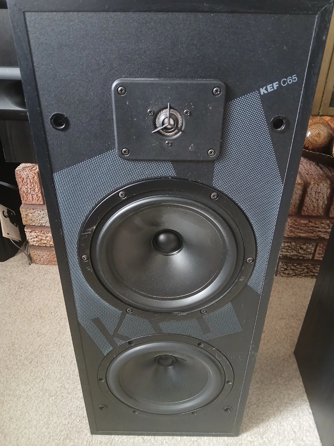 This pair of KEF C65 floorstanding speakers is in good working order. They have a sleek black finish and are designed for a rich audio experience. Each speaker features a tweeter, mid-range driver, and a bass driver.