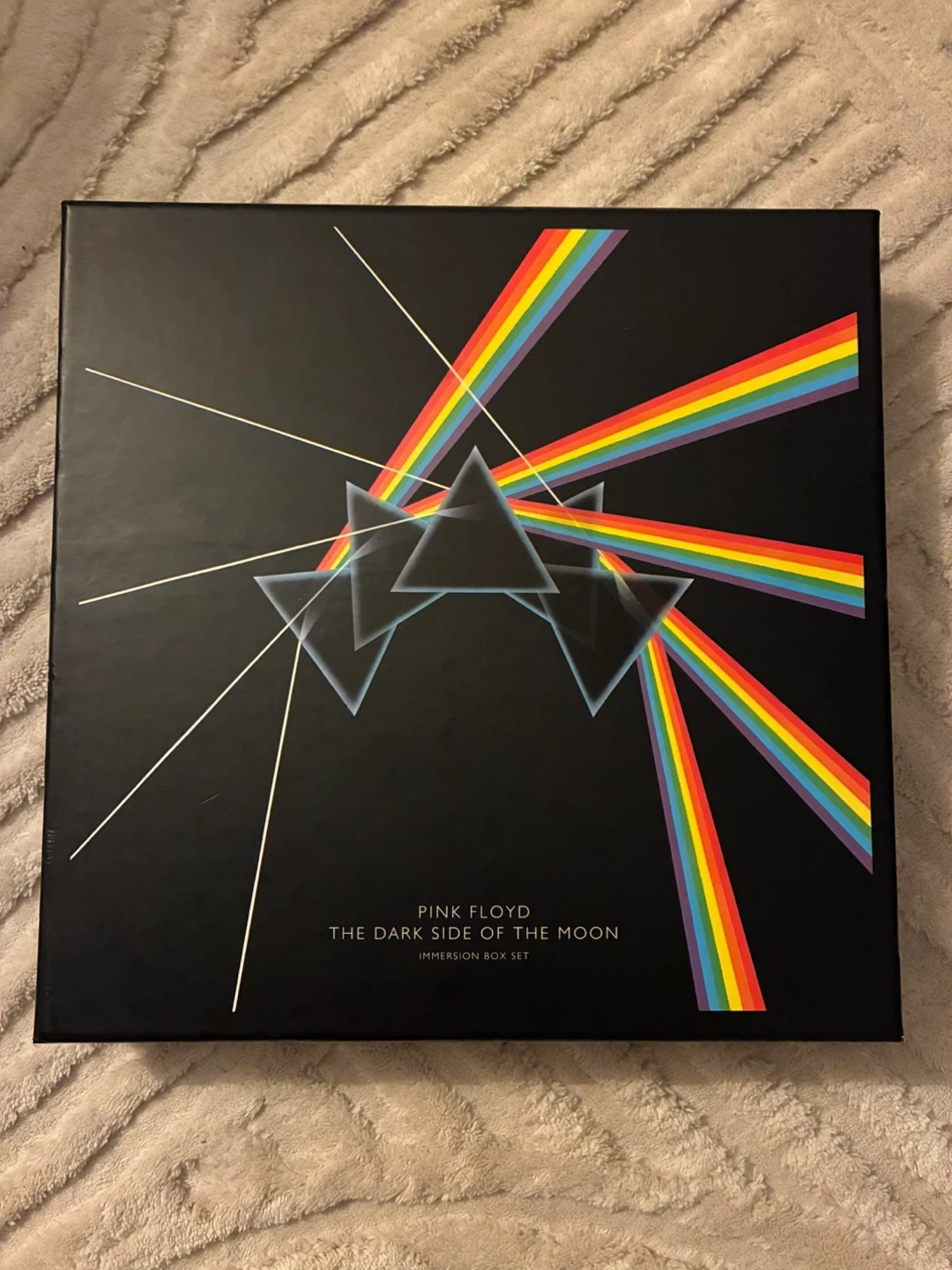This is the Pink Floyd The Dark Side of the Moon Immersion Box Set. It includes the original box, multiple CDs, collectors cards, coasters, and other accessories. It's a collector's edition for fans of the iconic album.