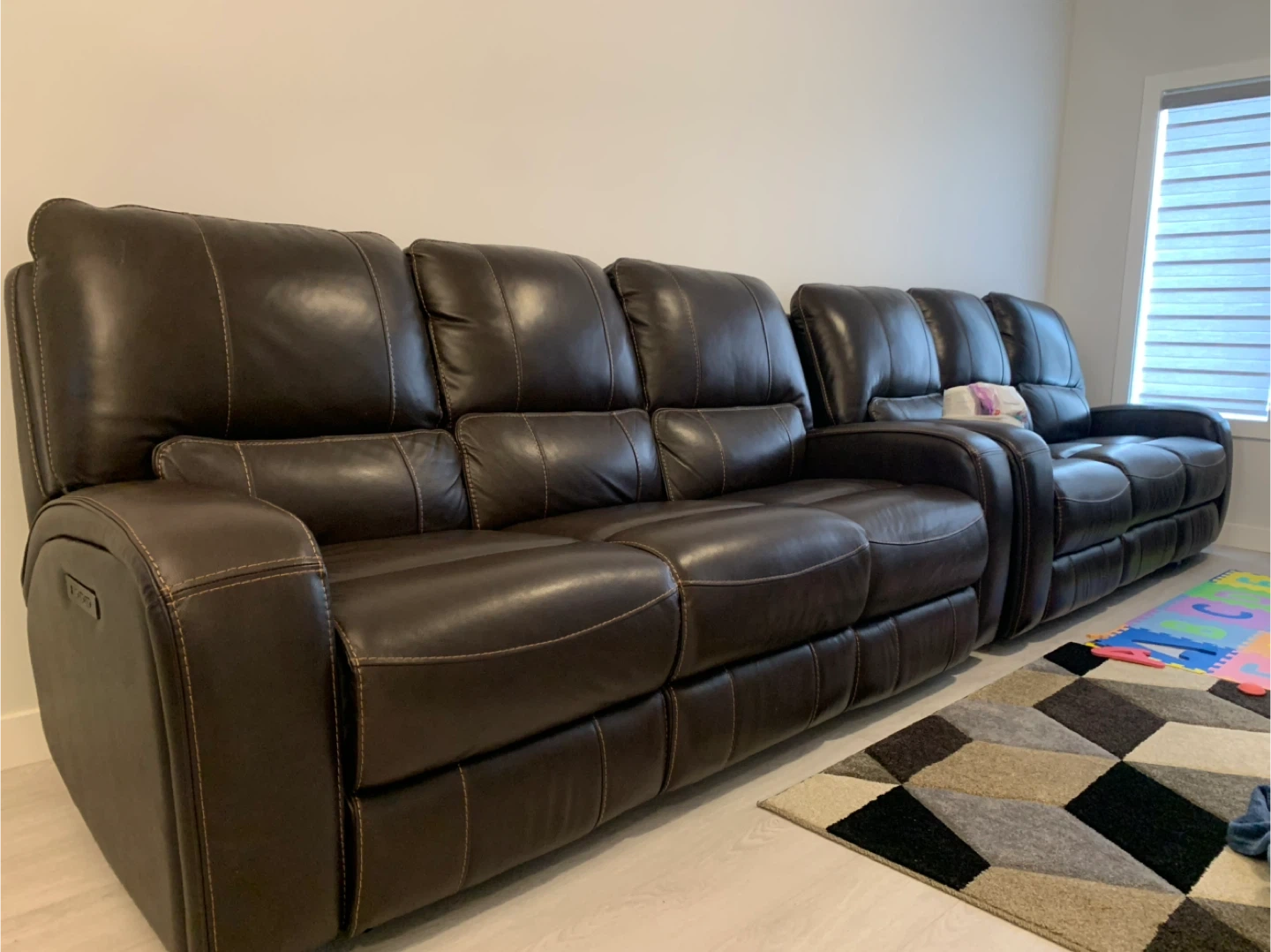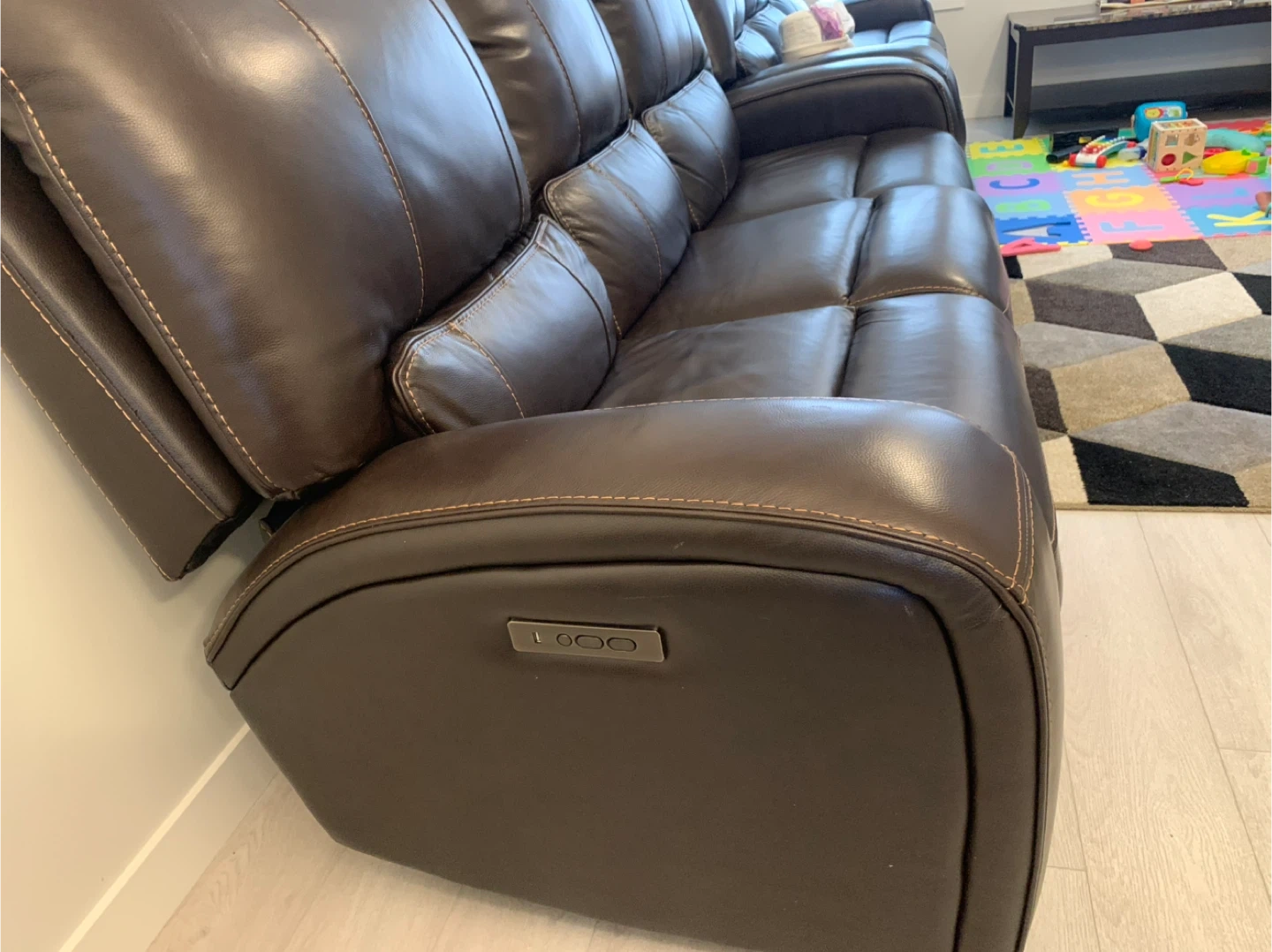 This is a comfortable brown leather power reclining sofa. It features a smooth reclining mechanism controlled by buttons on the side. The stitching is a nice contrast detail. It's a great addition for any living room! Just one piece.