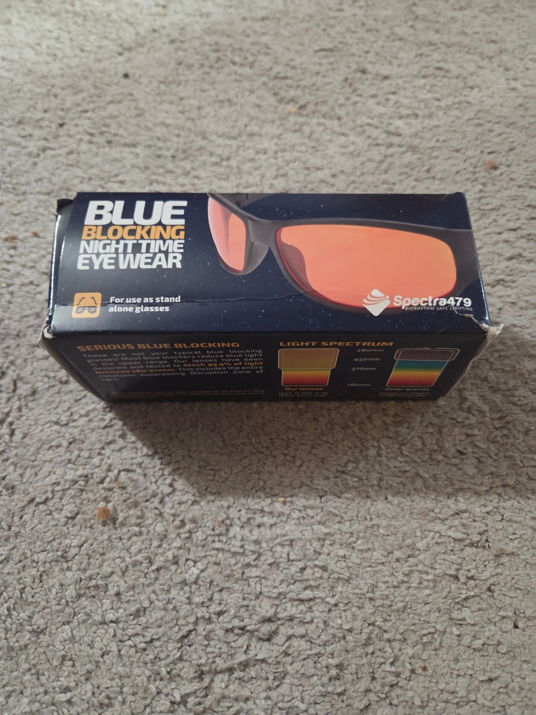 Improve your sleep with these premium Spectra479 Nighttime Blue Blockers. These are the high-quality 'Classic' model with a wraparound frame that prevents blue light from 'leaking' in through the sides—much more effective than standard flat blue-light glasses.
