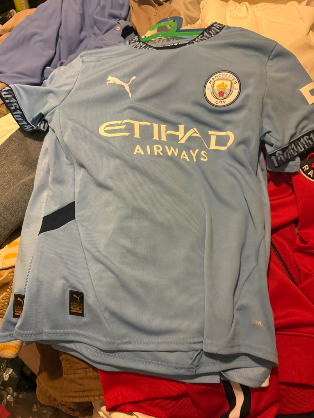 Manchester City football jersey with Etihad Airways sponsor. Puma branding and authentic football patches are visible. DryCELL technology fabric.