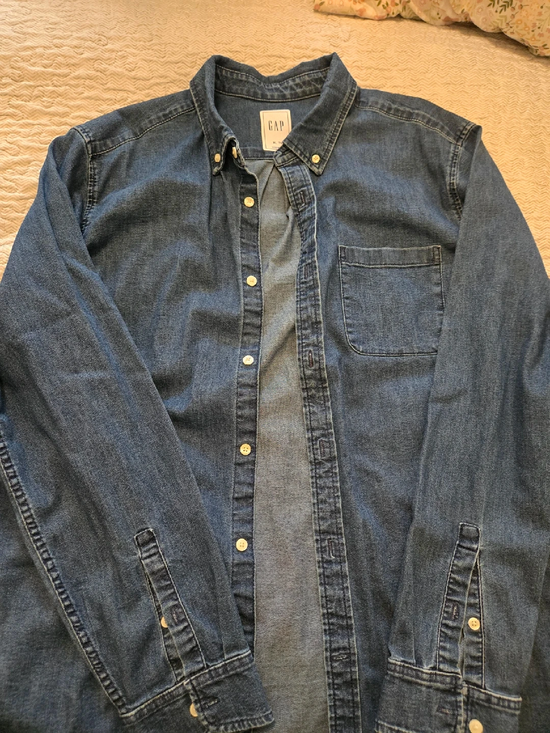 Selling a classic denim button-down shirt from GAP! It's in great condition and perfect for layering or wearing on its own. The size is XL.