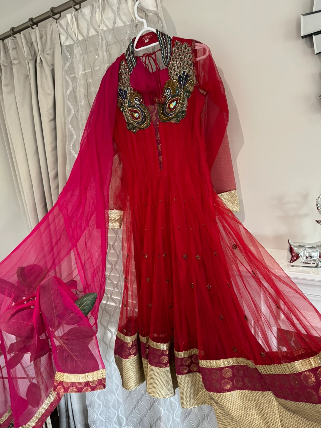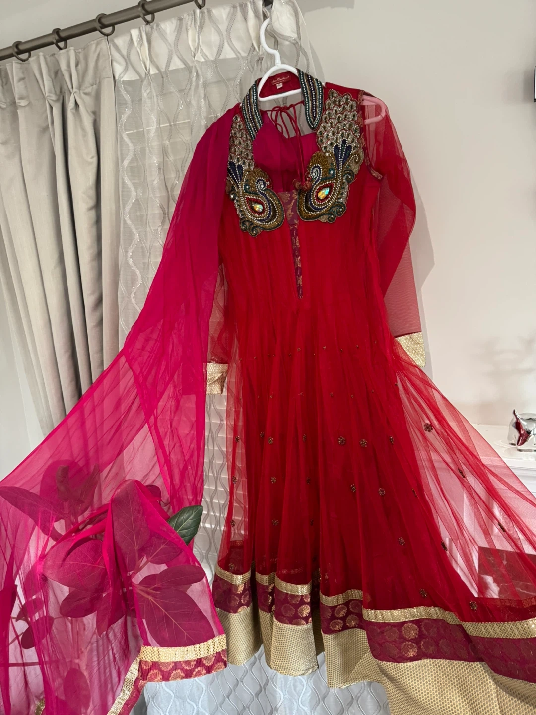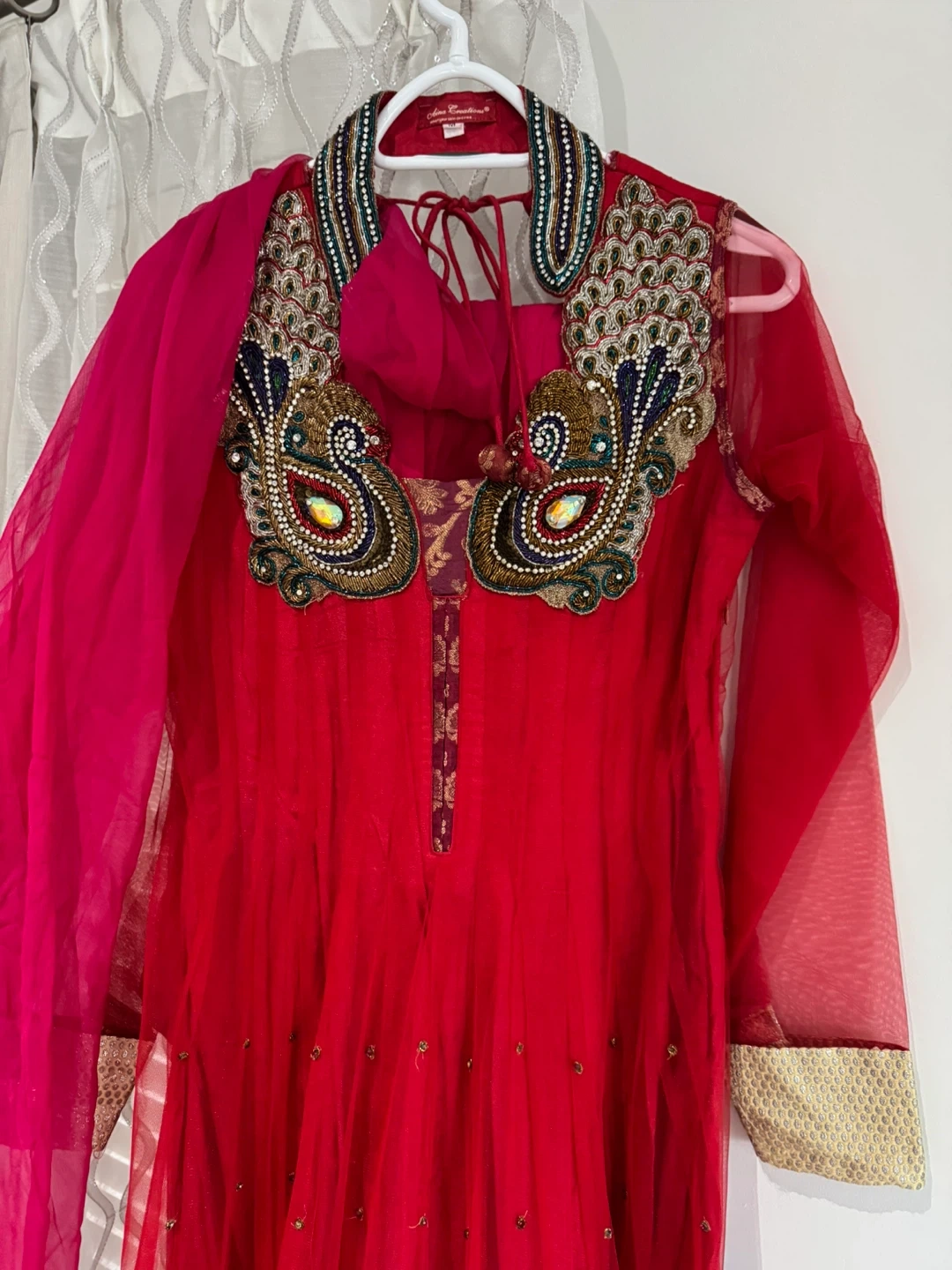 Beautiful red Anarkali suit featuring intricate beadwork and embellishments on the collar and sleeves. It comes with a matching sheer dupatta and churidaar. This outfit is perfect for celebrations and special events!