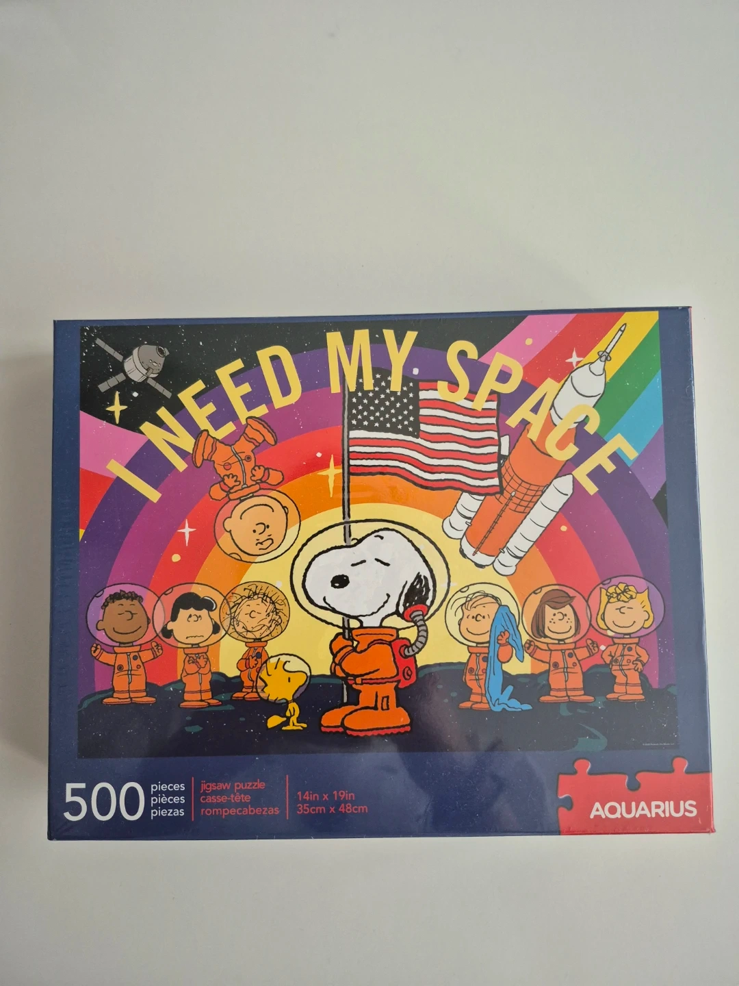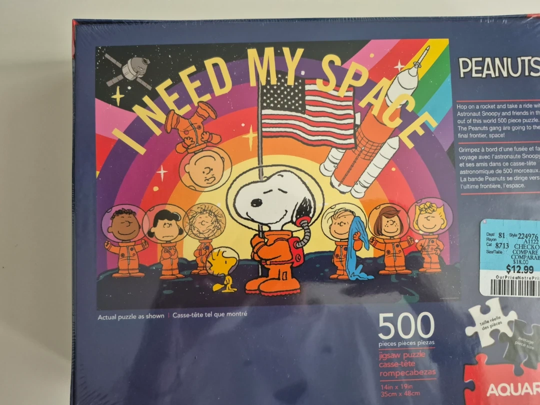This is a Peanuts 'I Need My Space' jigsaw puzzle by Aquarius. It contains 500 pieces and the finished puzzle is 14in x 19in (35cm x 48cm). The box is included!
