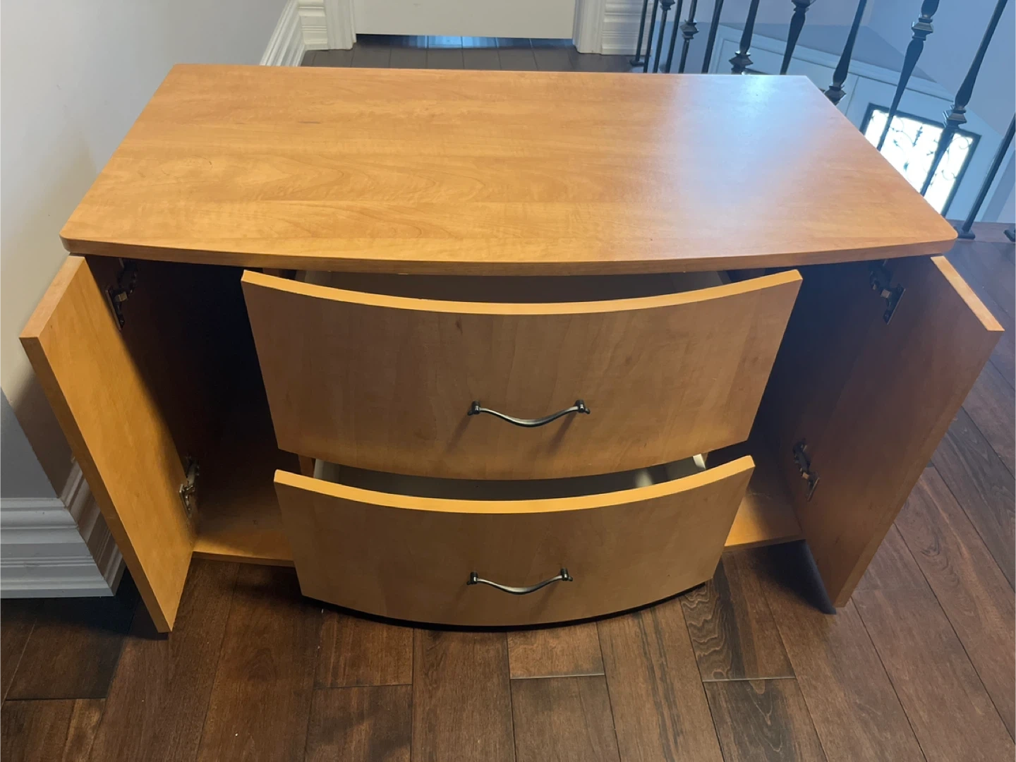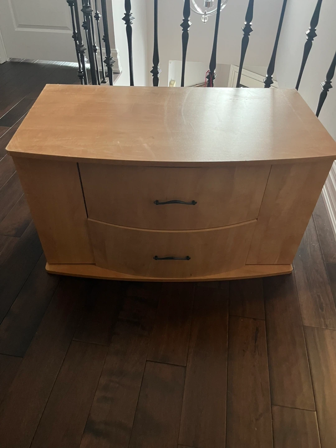 This cabinet is made of maple wood and features two drawers for storage. It has a light wood finish. It's a great piece for a bedroom or living room.