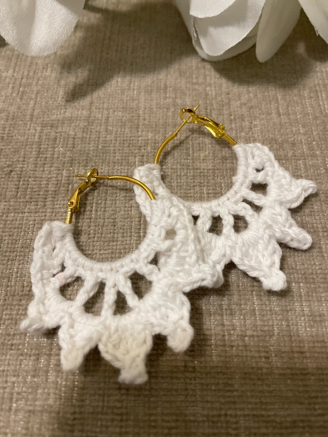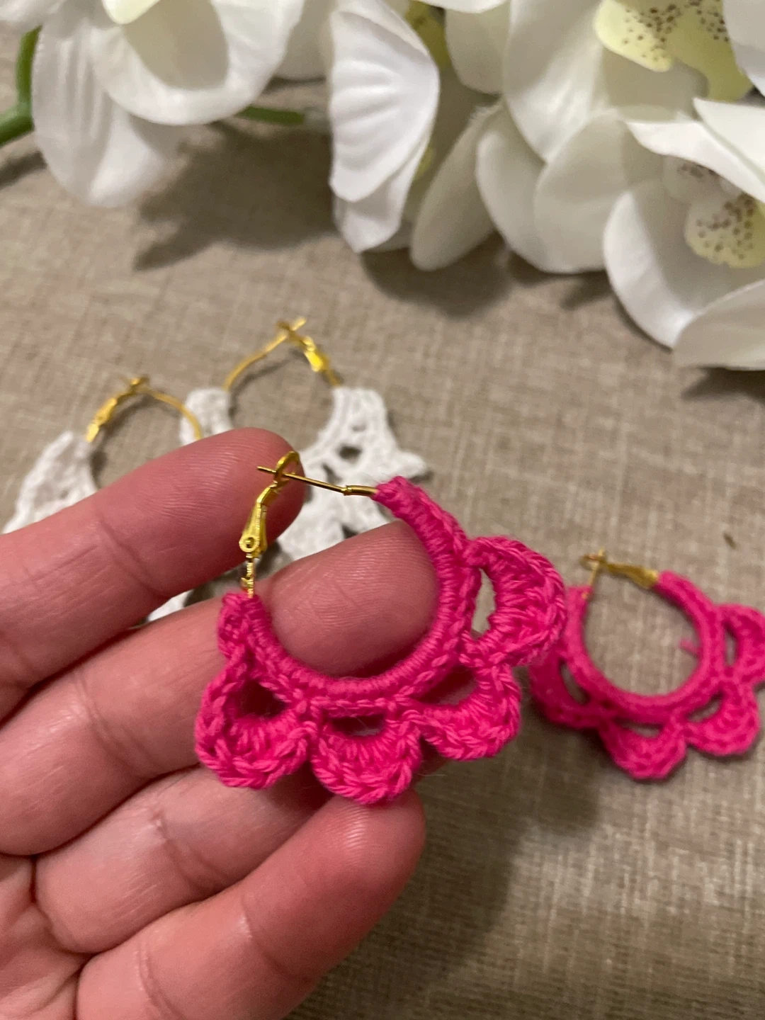 These are a cute pair of handmade hoop earrings. They're made from crochet thread and feature gold-tone hardware. Available in vibrant pink and classic white.