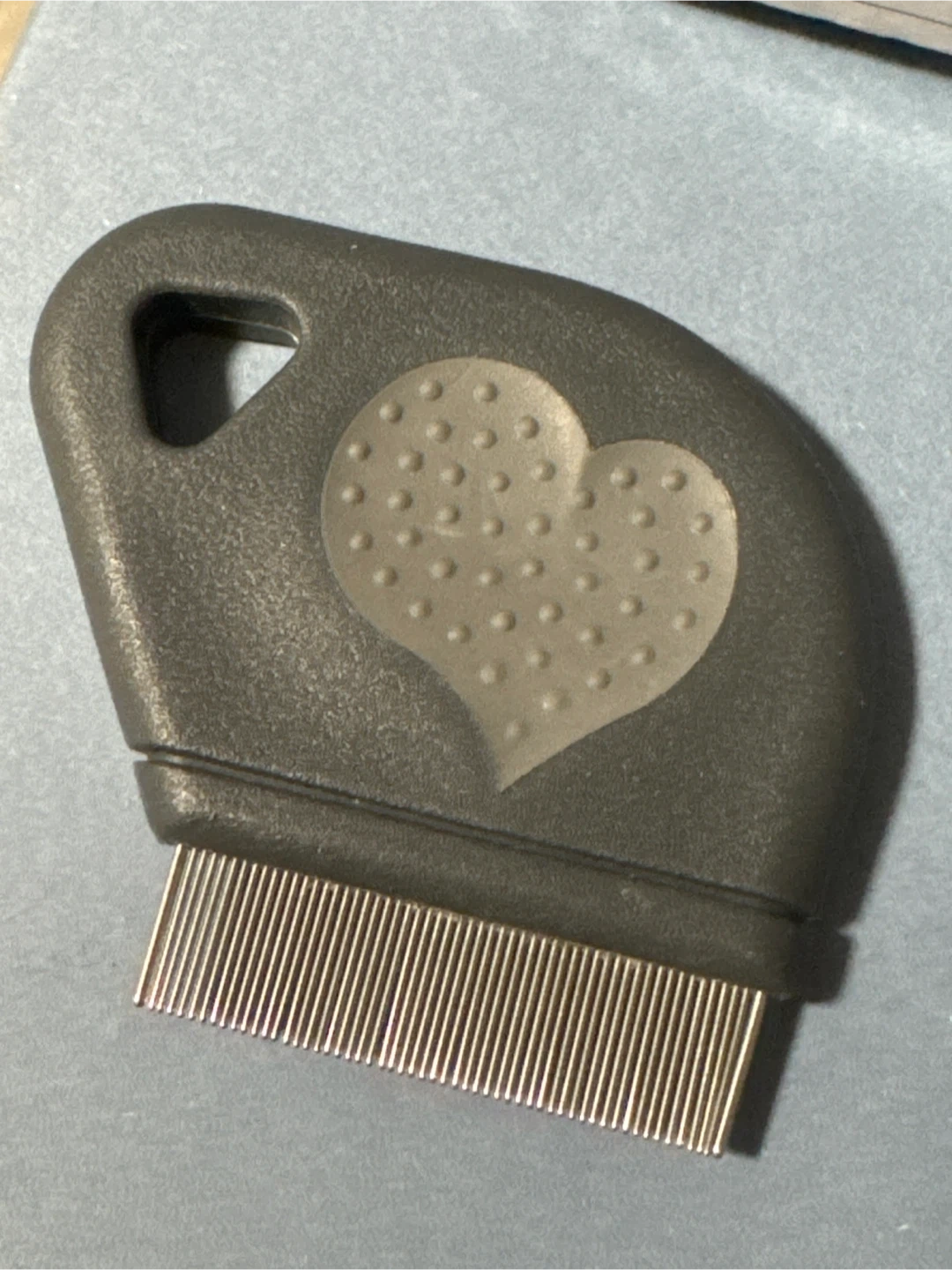 This is a pet flea comb with fine metal teeth. It has a grey plastic handle with a heart-shaped textured grip. Great for removing fleas and debris from your pet's fur!