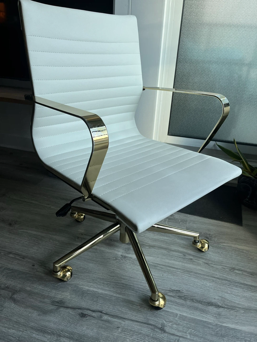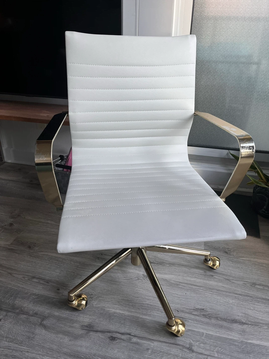 Selling a stylish white office chair with gold accents. It's in great condition and would be a lovely addition to any home office.