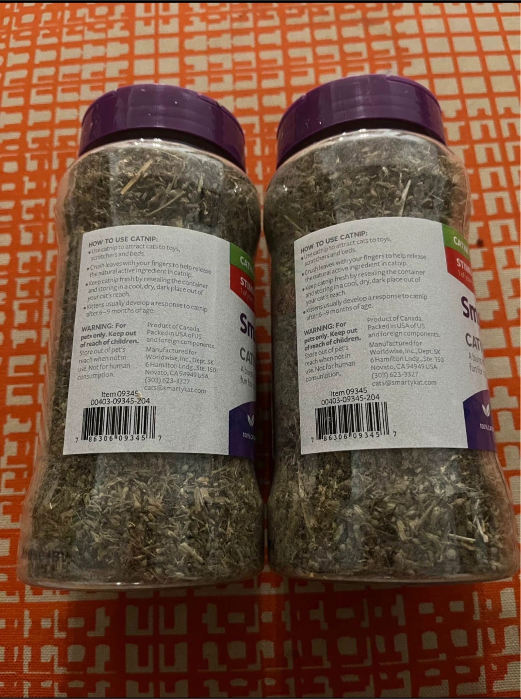 Two jars of 100% catnip. Catnip provides a burst of energetic fun for cats and is essential for their health, mental and physical stimulation. Each jar contains 2 oz (56g) of product.