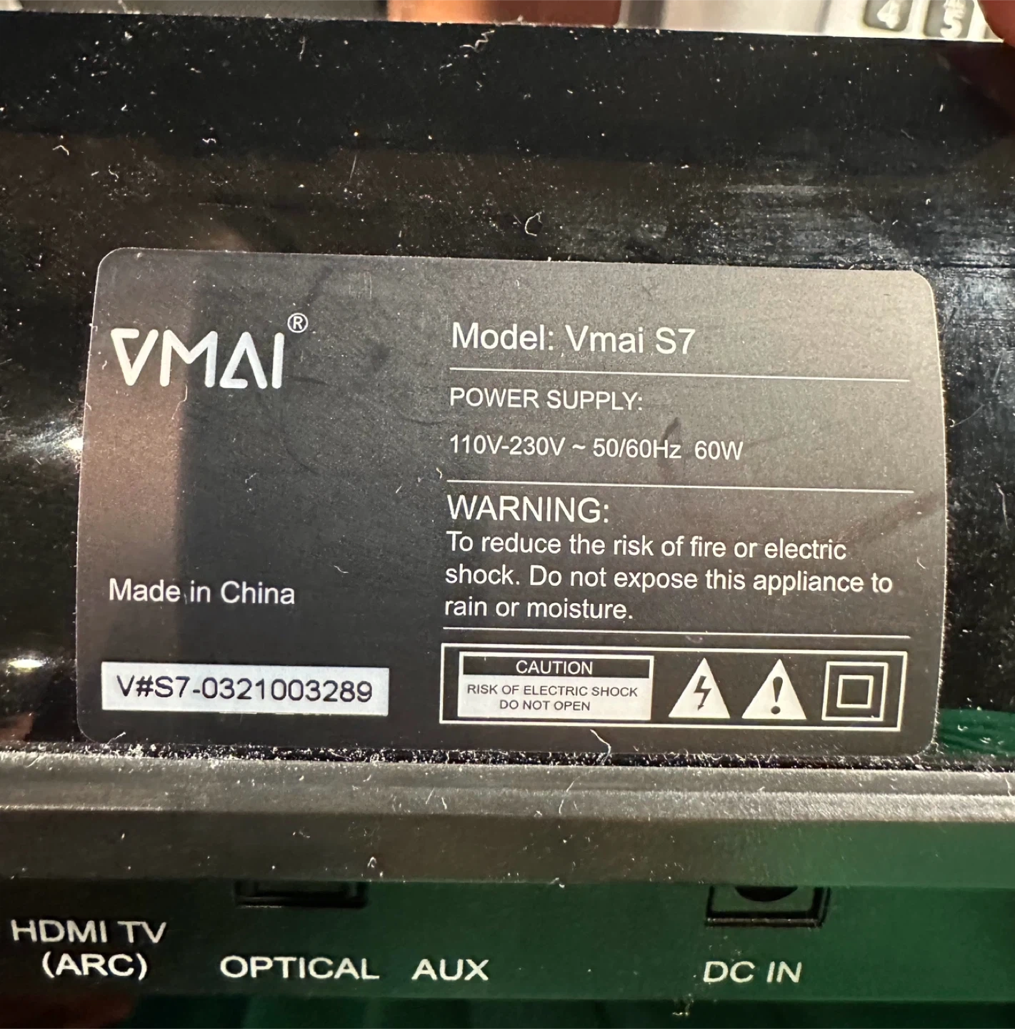 Vmai S7 soundbar with Bluetooth Power supply 110V-230V, 50/60Hz, 60W. Made in China. Connections include HDMI TV (ARC), Optical, and AUX. Like new in excellent condition.