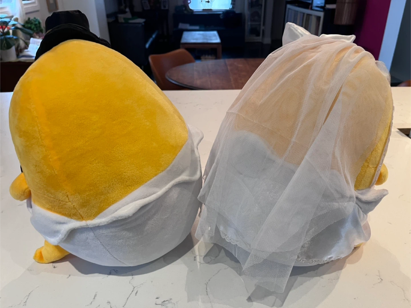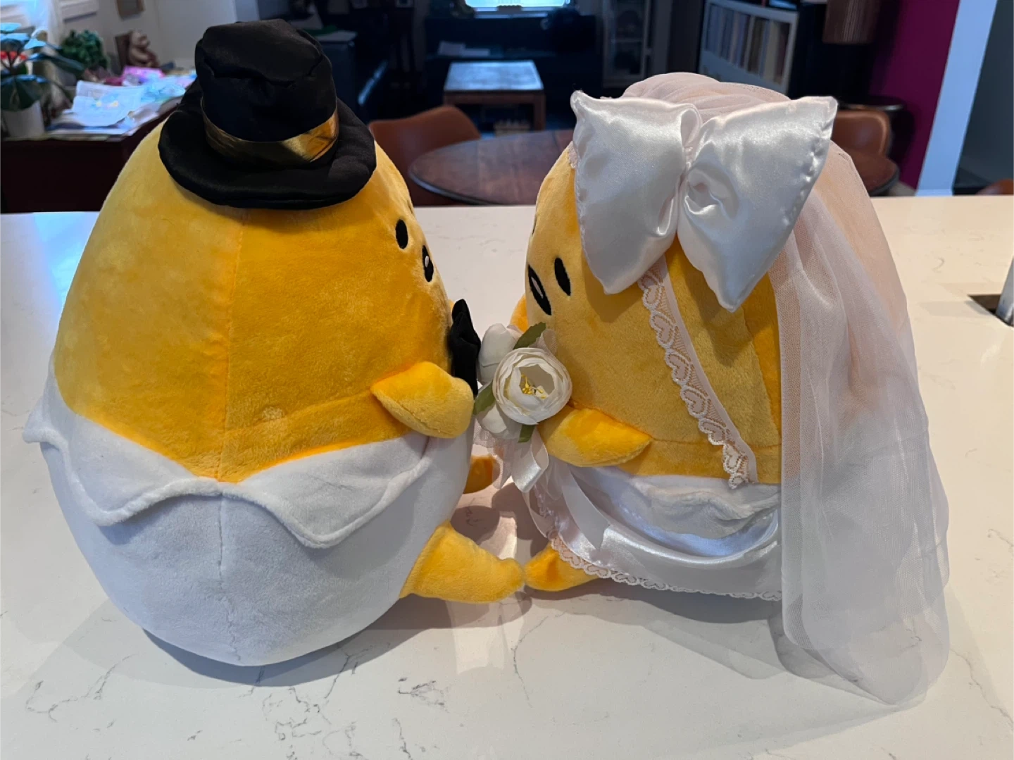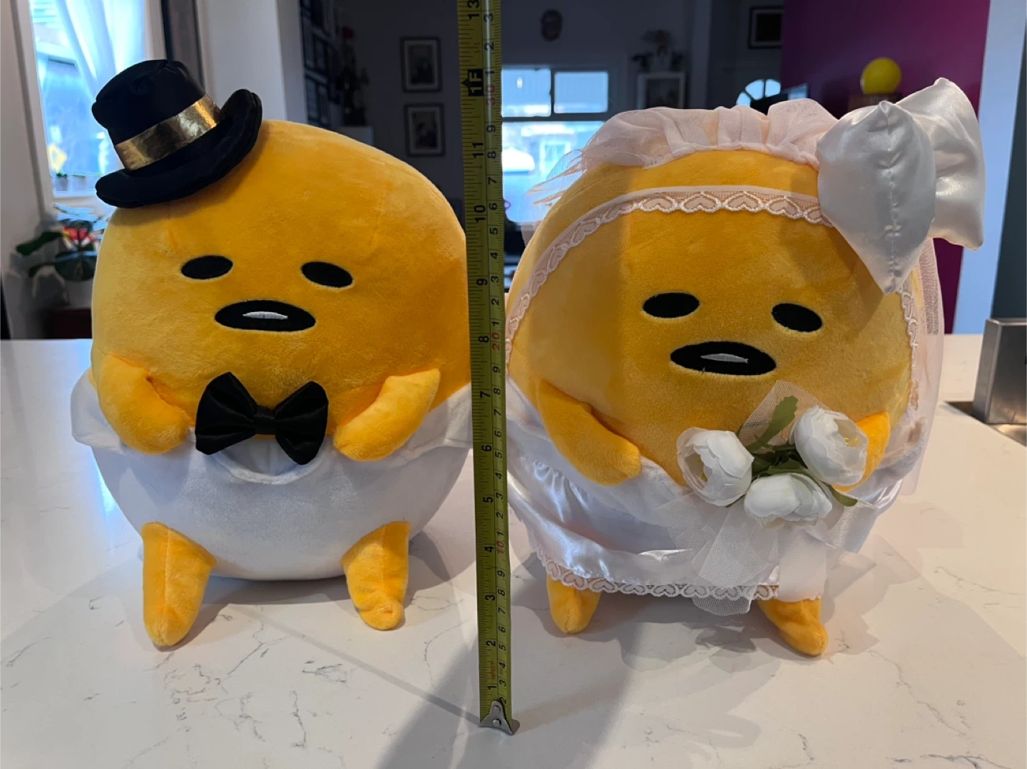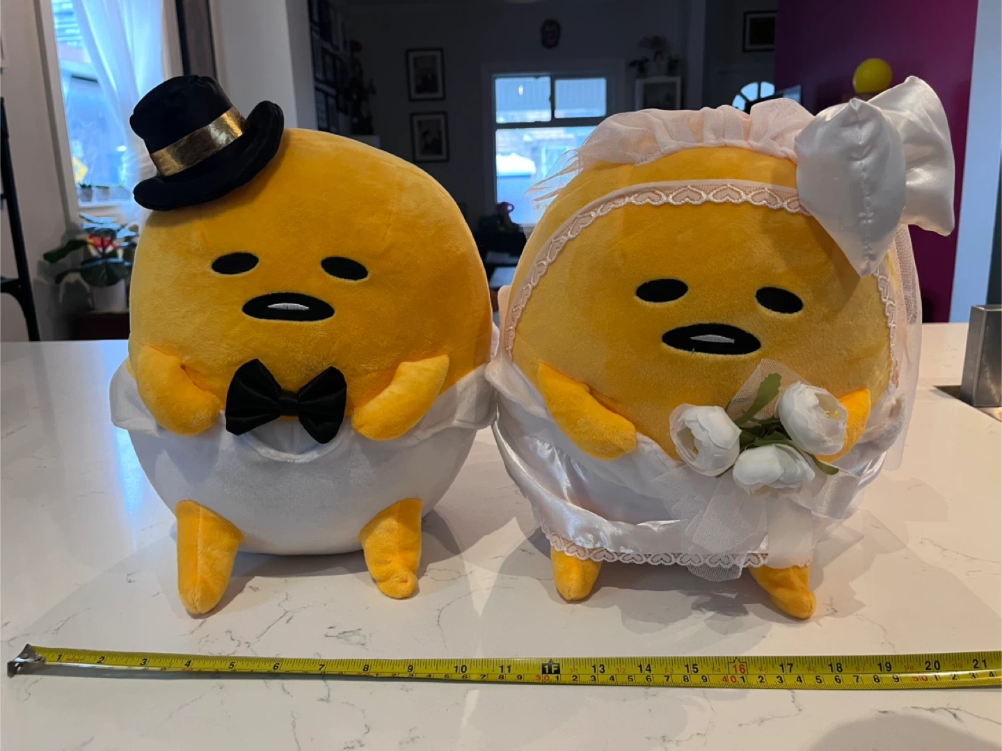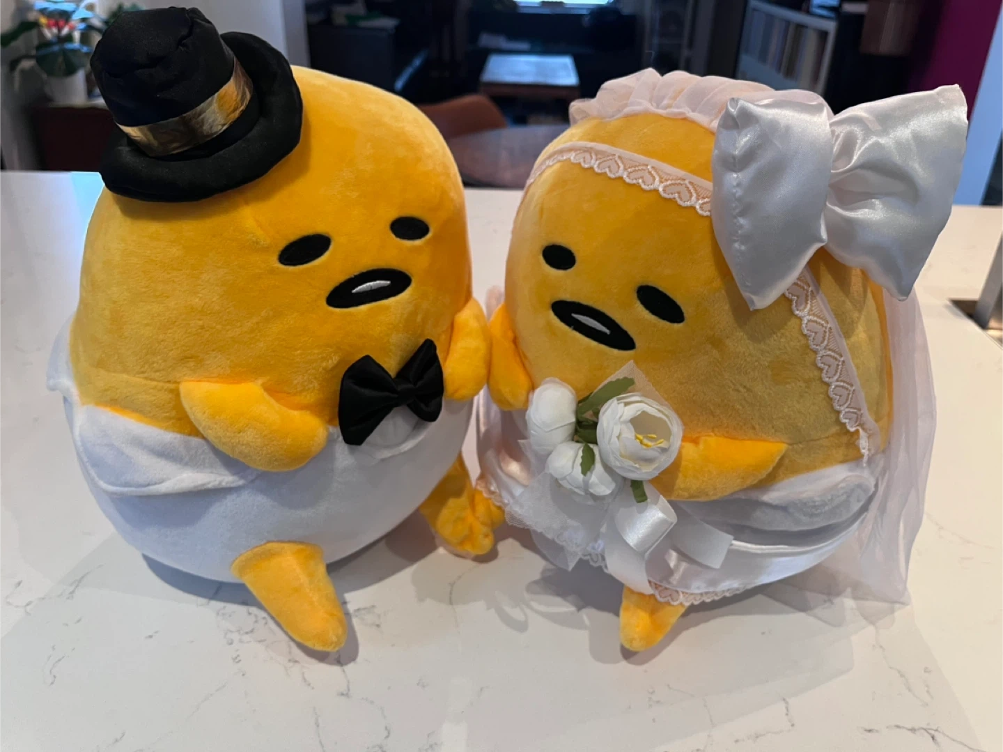 A set of 2 large gudetama plush, each standing 11.5” high and 10.5” wide. All clothing/flowers/ribbons/veil attached and in good condition. A very faint stain on the underside of the bride (see last photo). No tags or box.