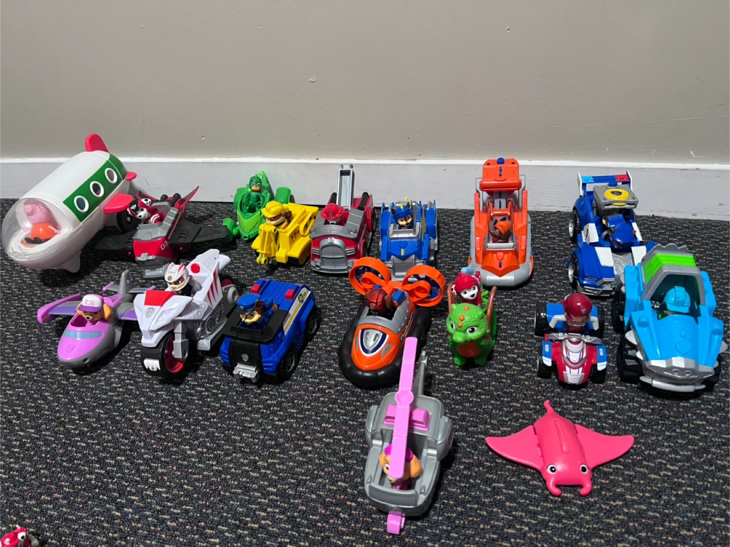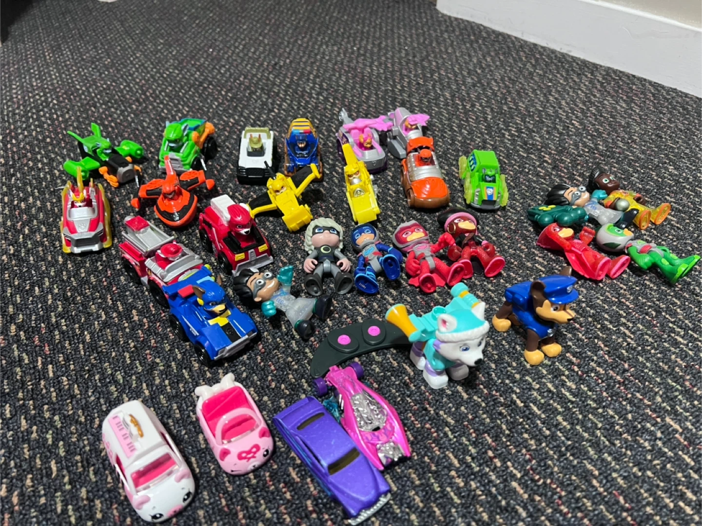 This is a collection of toy vehicles, including Paw Patrol characters and other assorted cars, planes, and emergency vehicles. Great for imaginative play!