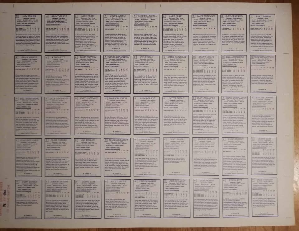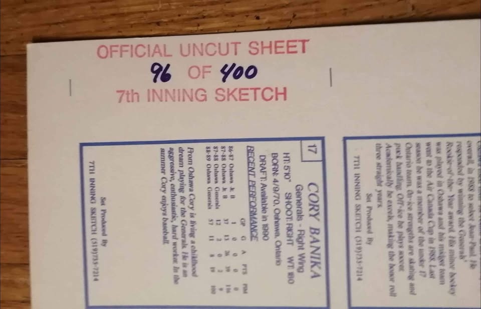 Rare Limited Print of 1989-90 7th Inning Sketch Hockey Cards! Uncut Oshawa Generals Team Set Sheet. 45 total cards. Sheet #96 of 400. Eric Lindros Pre-Rookie Card. A rare 35 year old piece of hockey memorabilia!