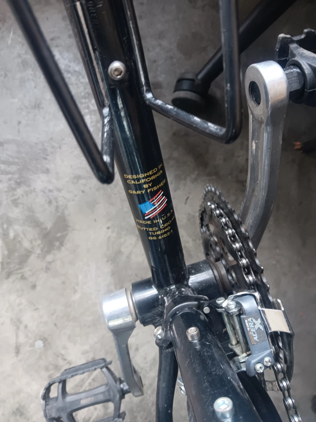 A black Gary Fisher mountain bike, model "MAMBA". It's designed in California and made in the U.S.A. This bike is great for trails and casual riding.