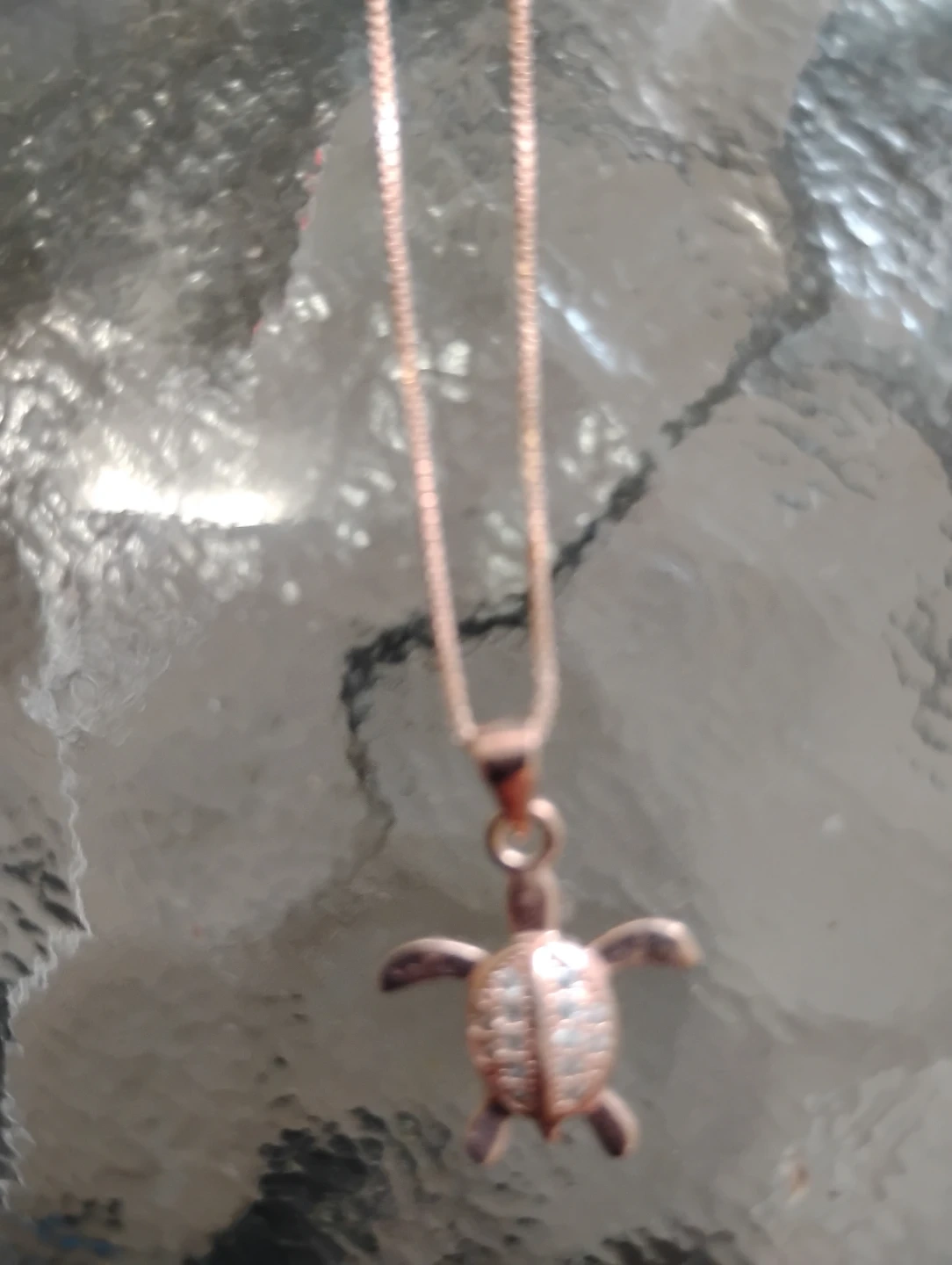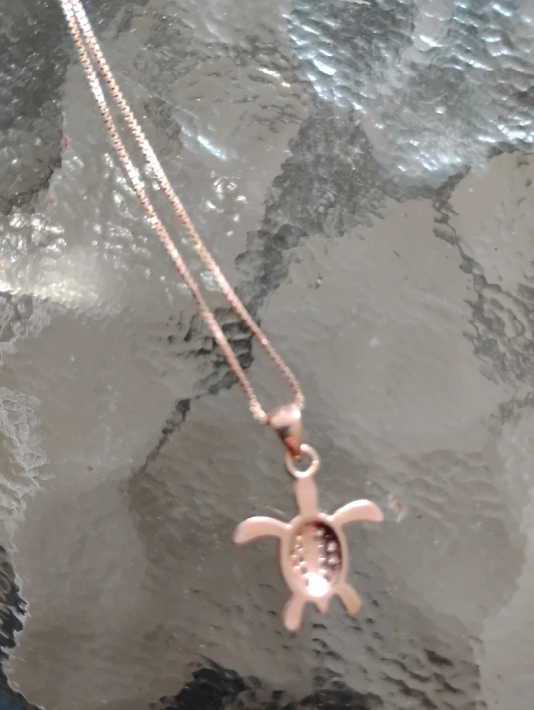 A cute turtle pendant necklace! It's in great condition and ready to be worn. The pendant is a lovely rose gold colour with sparkly stones on the turtle's shell.